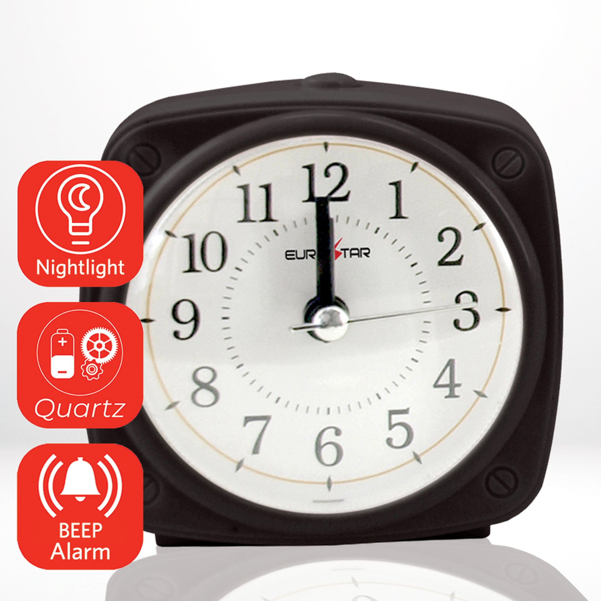 Simplicity meets functionality! Stay punctual with the EUROSTAR Alarm Clock-your perfect bedside companion. Perfect for bedrooms, dorm rooms and travel featuring quartz movement, analog display, beep alarm, and nightlight.