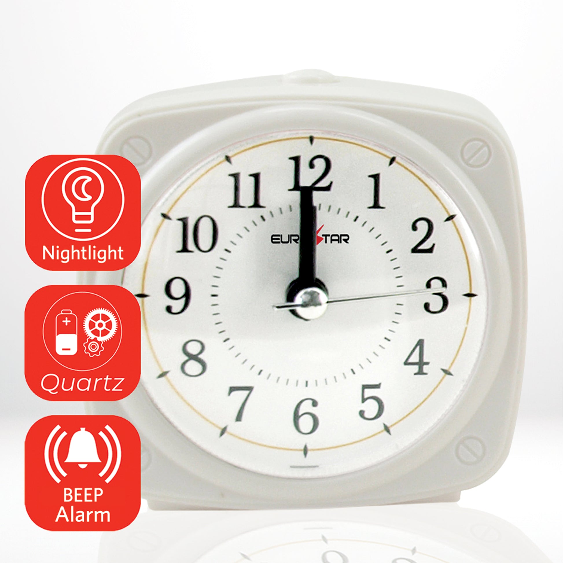 Simplicity meets functionality! Stay punctual with the EUROSTAR Alarm Clock-your perfect bedside companion. Perfect for bedrooms, dorm rooms and travel featuring quartz movement, analog display, beep alarm, and nightlight.
