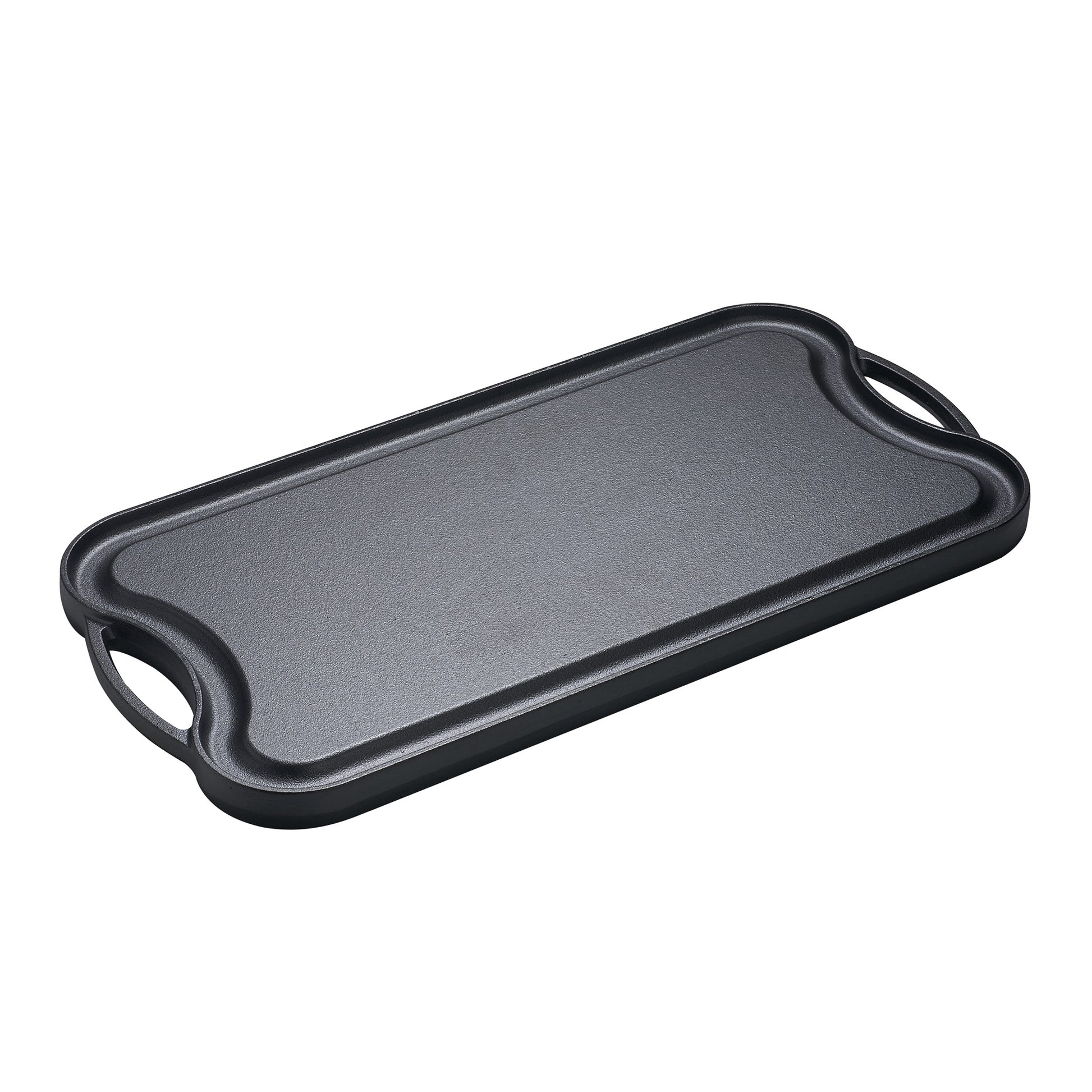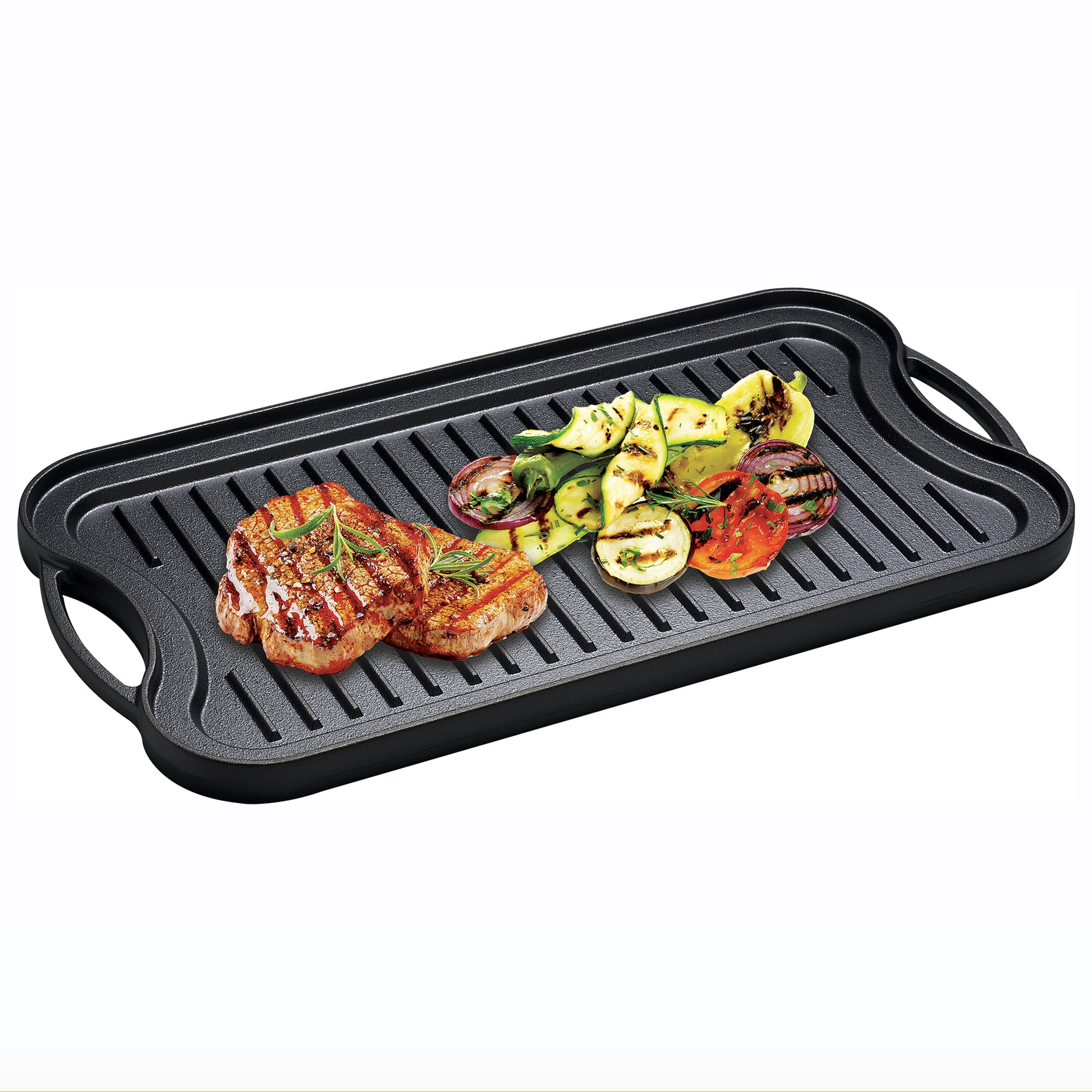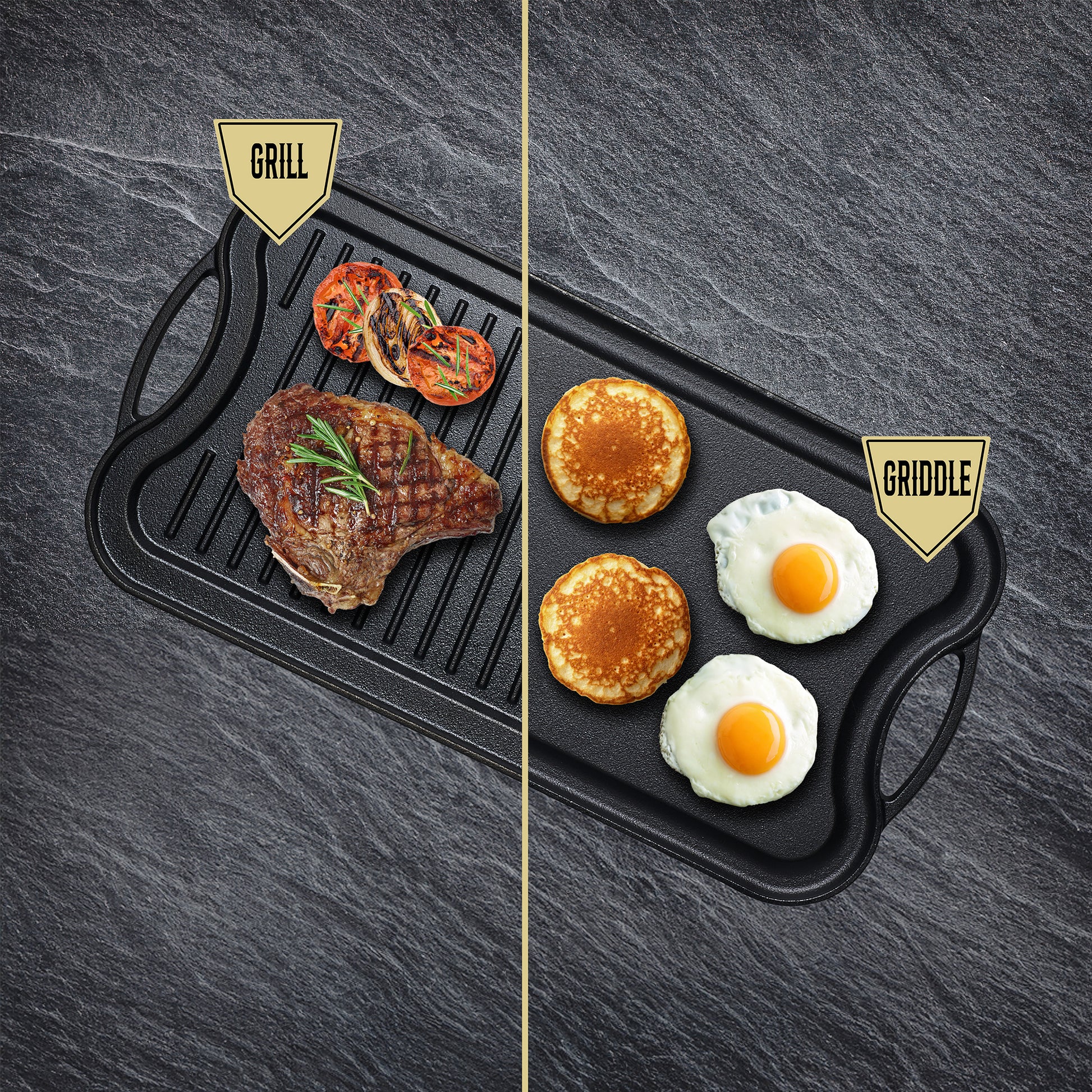 Double the surface, double the flavor. The EUROSTAR Reversible Cast Iron Grill/Griddle is your all-in-one cooking companion, delivering restaurant-quality results right at home or outdoors. One side features deep ridges for grilling meats and veggies, while the smooth griddle side is perfect for pancakes, eggs, and more. Built-in grease channels help reduce mess, and integrated handles make it easy to lift, flip, and maneuver. Pre-seasoned and ready to go, this heavy-duty cast iron surface performs beautifully across all heat sources - from stovetop to campfire. Includes silicone handle covers for easy handling. Cleanup's a breeze with the bonus grill and pan scrapers - because great cooking should be simple from start to finish.