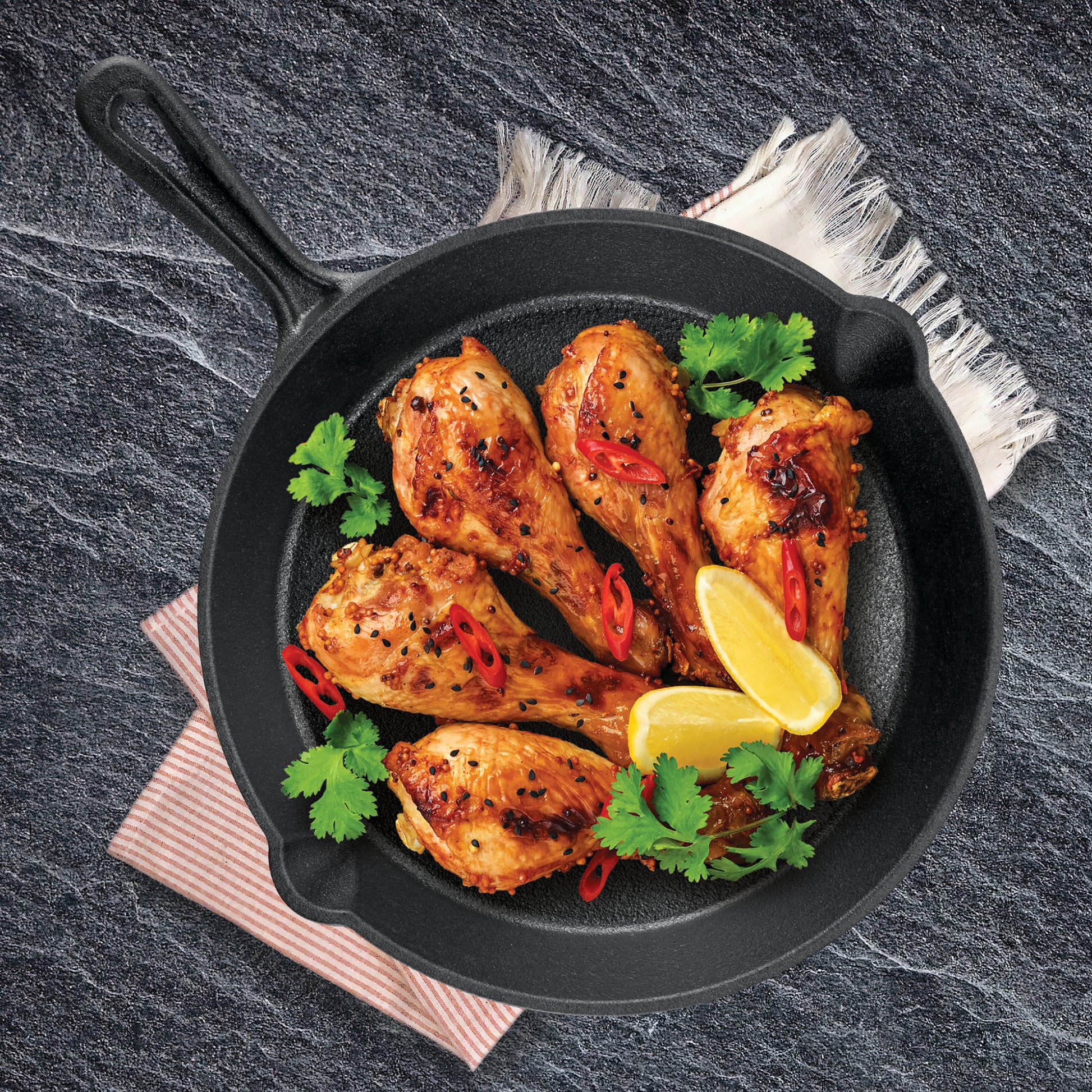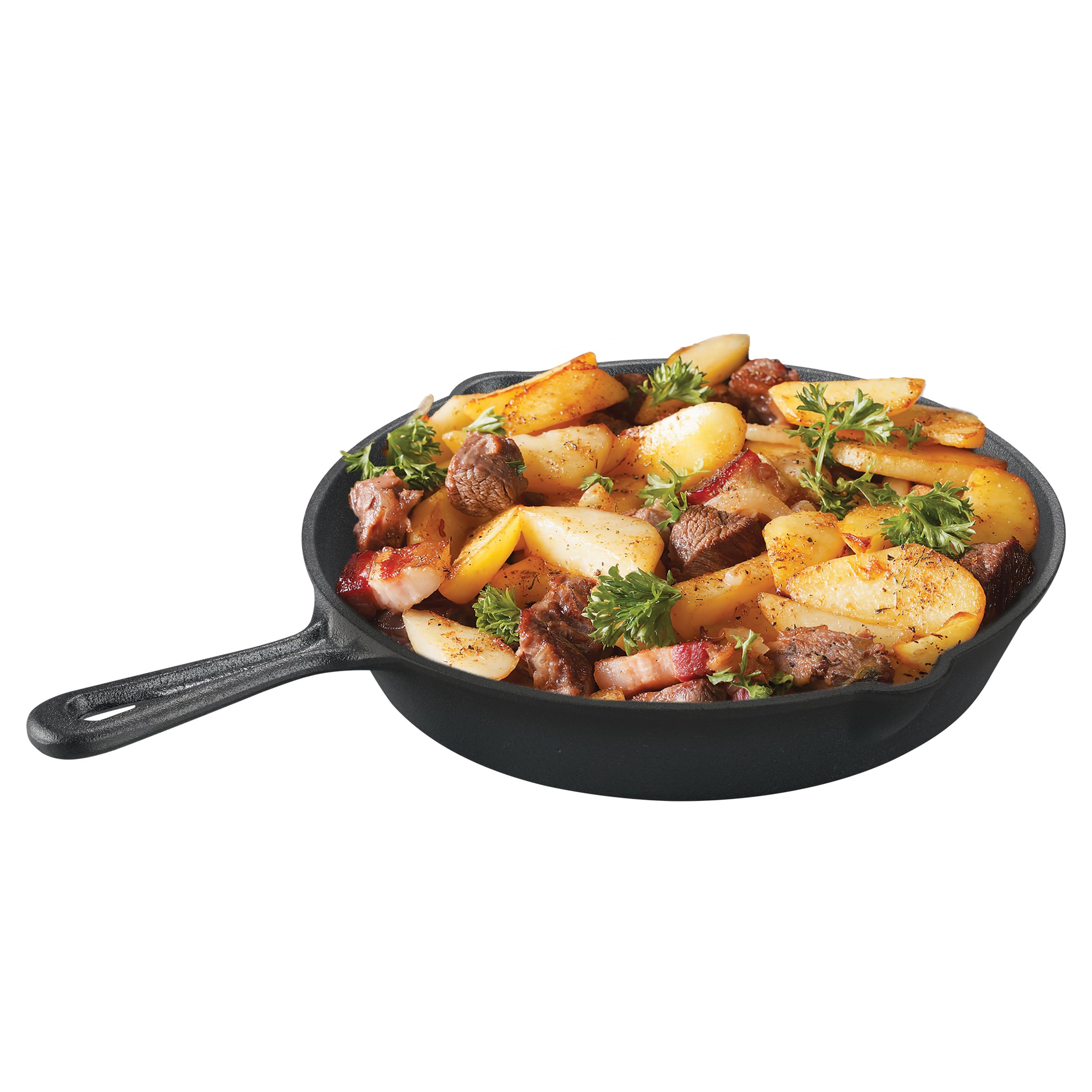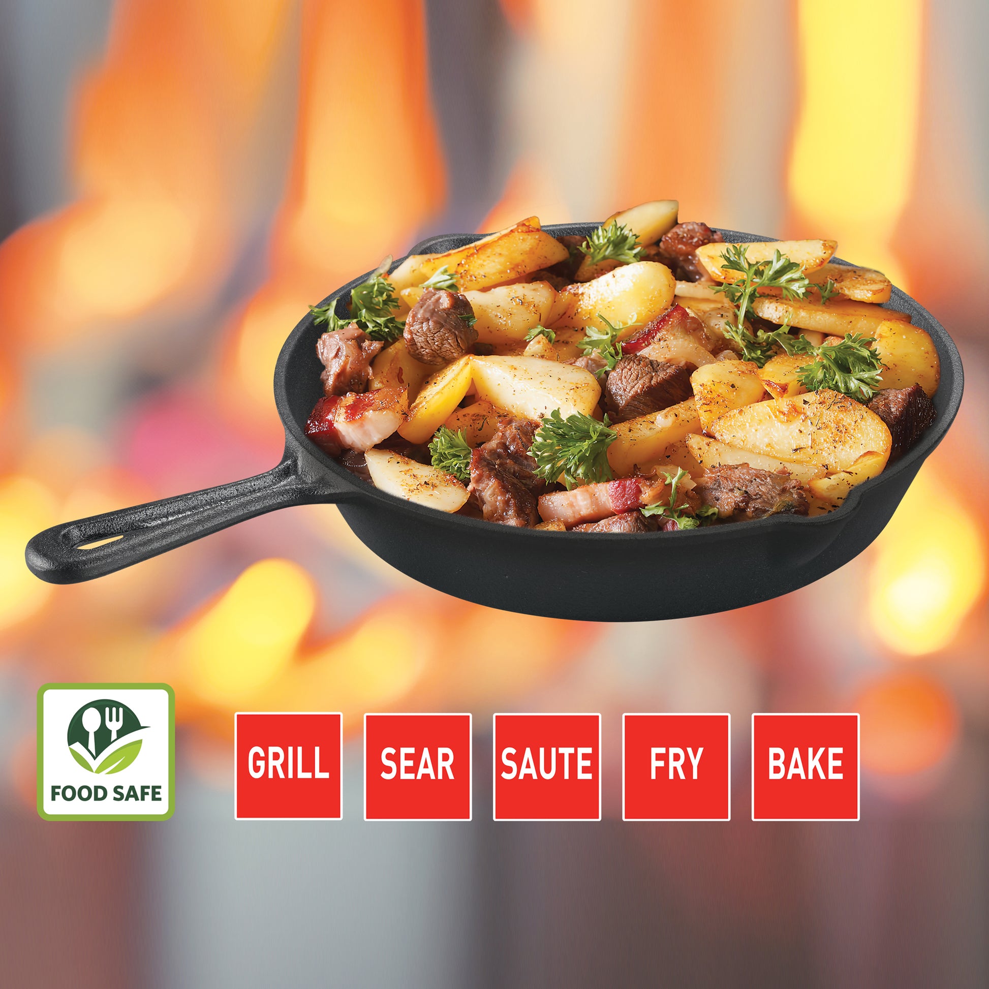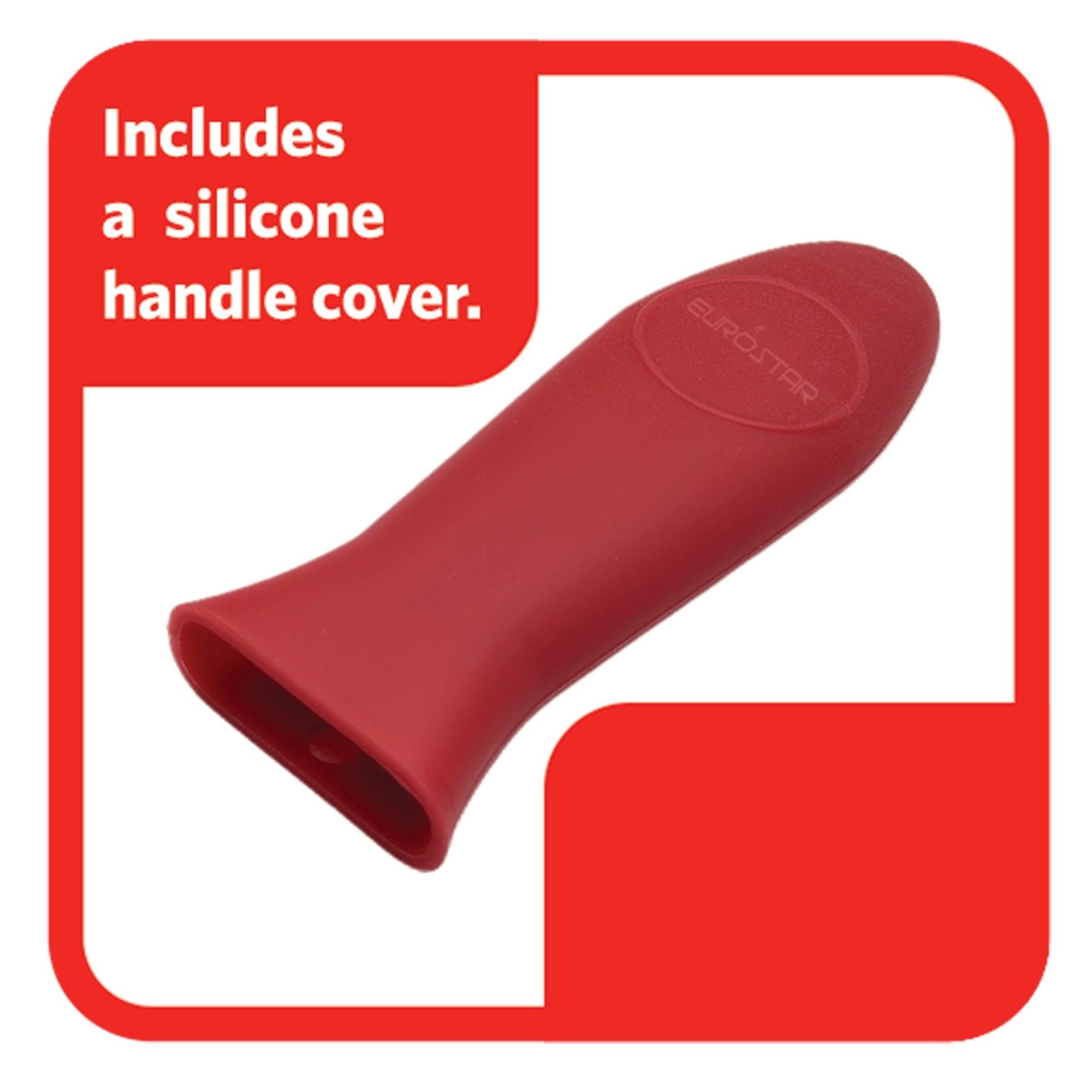 Sear. Grill. Bake. Fry. Love every meal. Elevate your cooking game with the EUROSTAR 8" Pre-Seasoned Cast Iron Skillet. Designed for performance and built to last, this versatile skillet goes from stovetop to oven with ease. Featuring two convenient pour spouts, a large hanging eyelet for storage and an ergonomic handle for comfortable grip and control, it's your new kitchen essential. Plus, it includes a heat-resistant silicone handle cover for safe handling and effortless cooking.