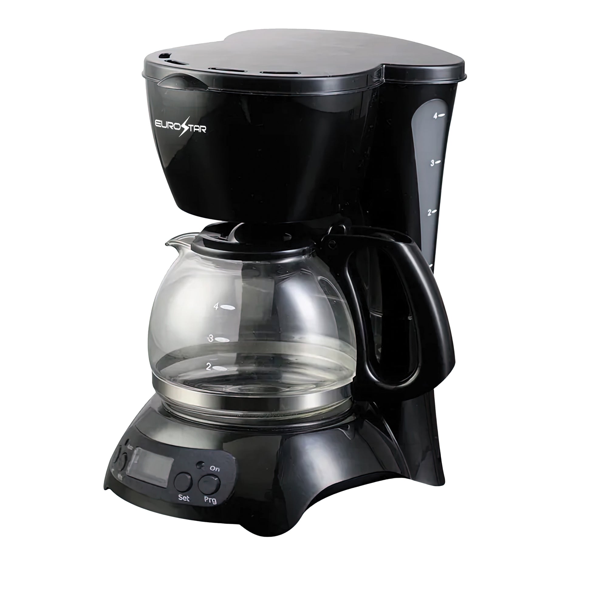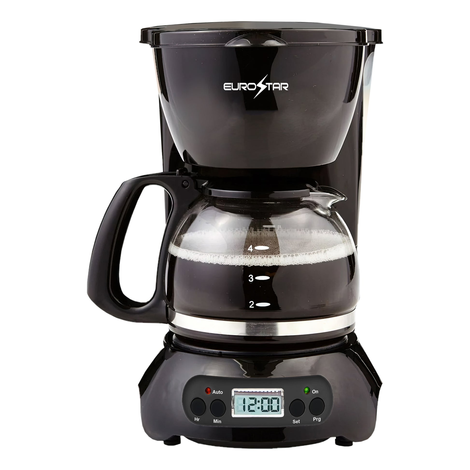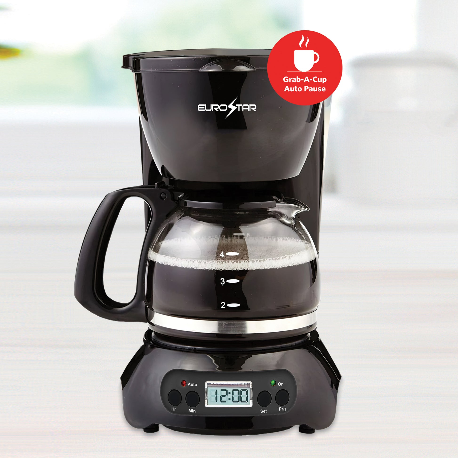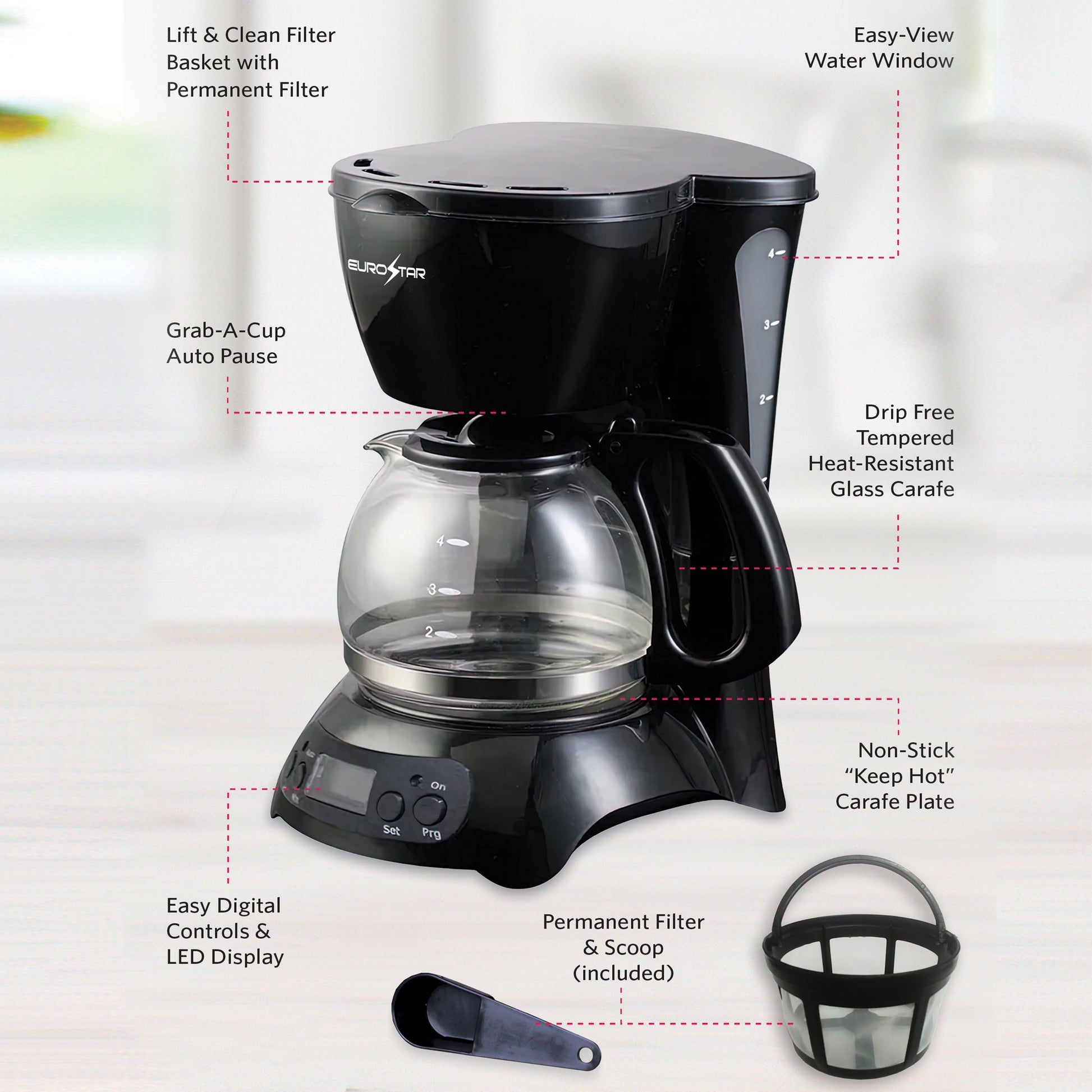 Start your day off right with the EUROSTAR Coffeemaker! Enjoy fresh, flavorful coffee every time with ease. 4-Cup capacity programmable coffeemaker features a lift & clean filter basket with filter, easy view water window, grab-a-cup auto pause, drip free tempered heat resistant glass carafe, non-stick keep hot carafe plate, easy digital controls and LED display. Includes a permanent filter and scoop.