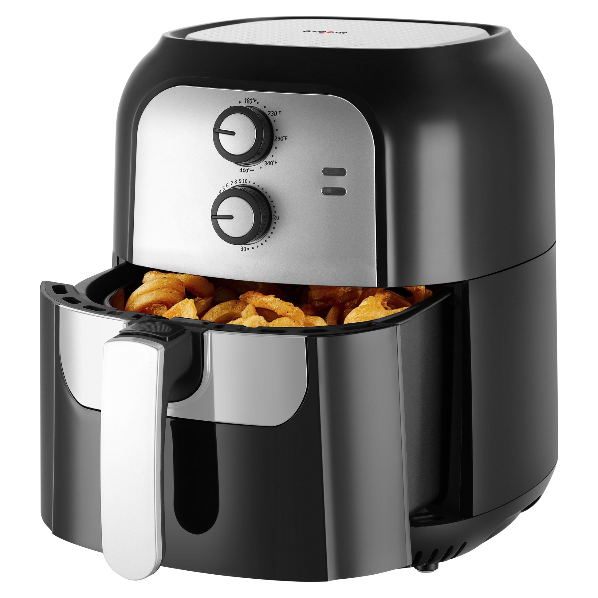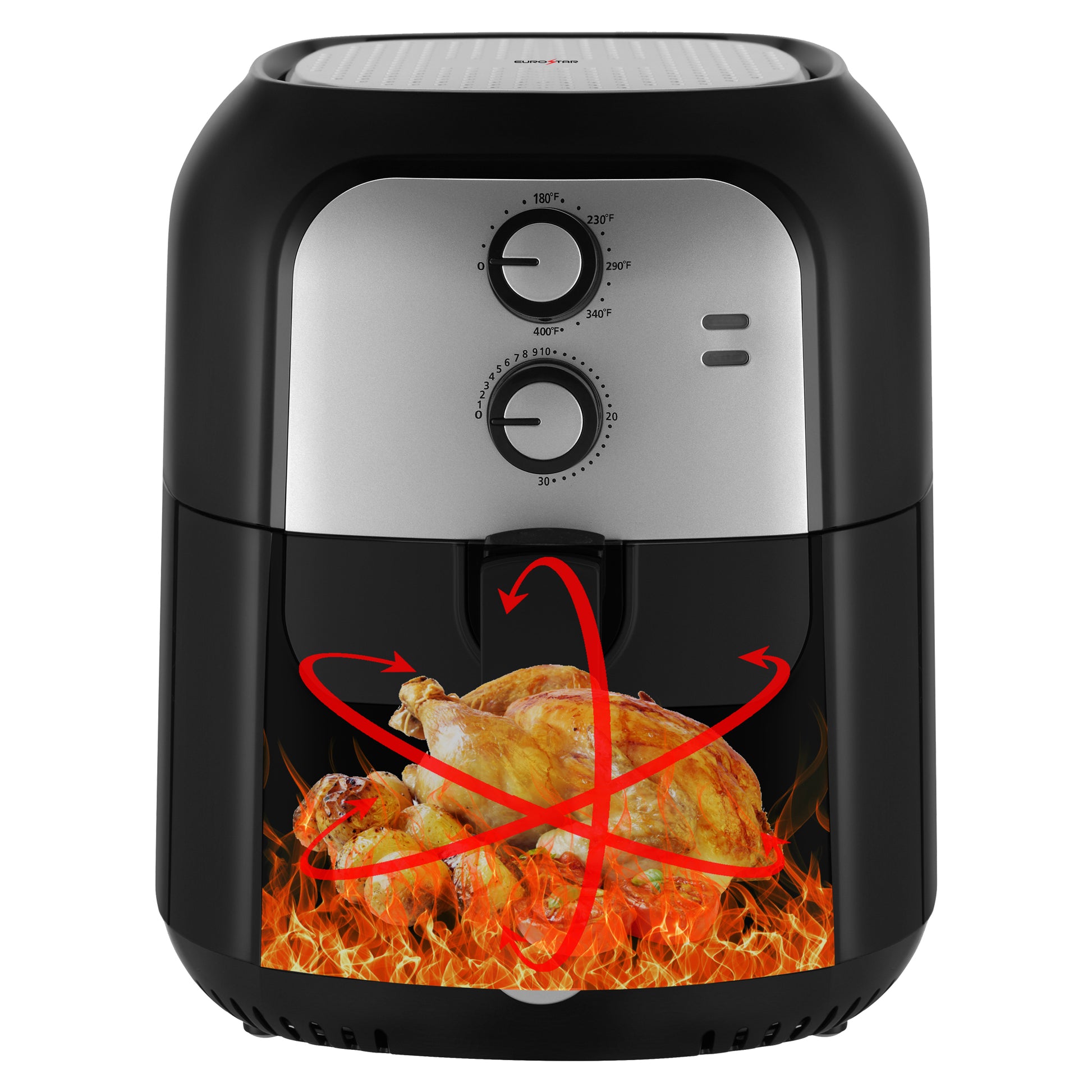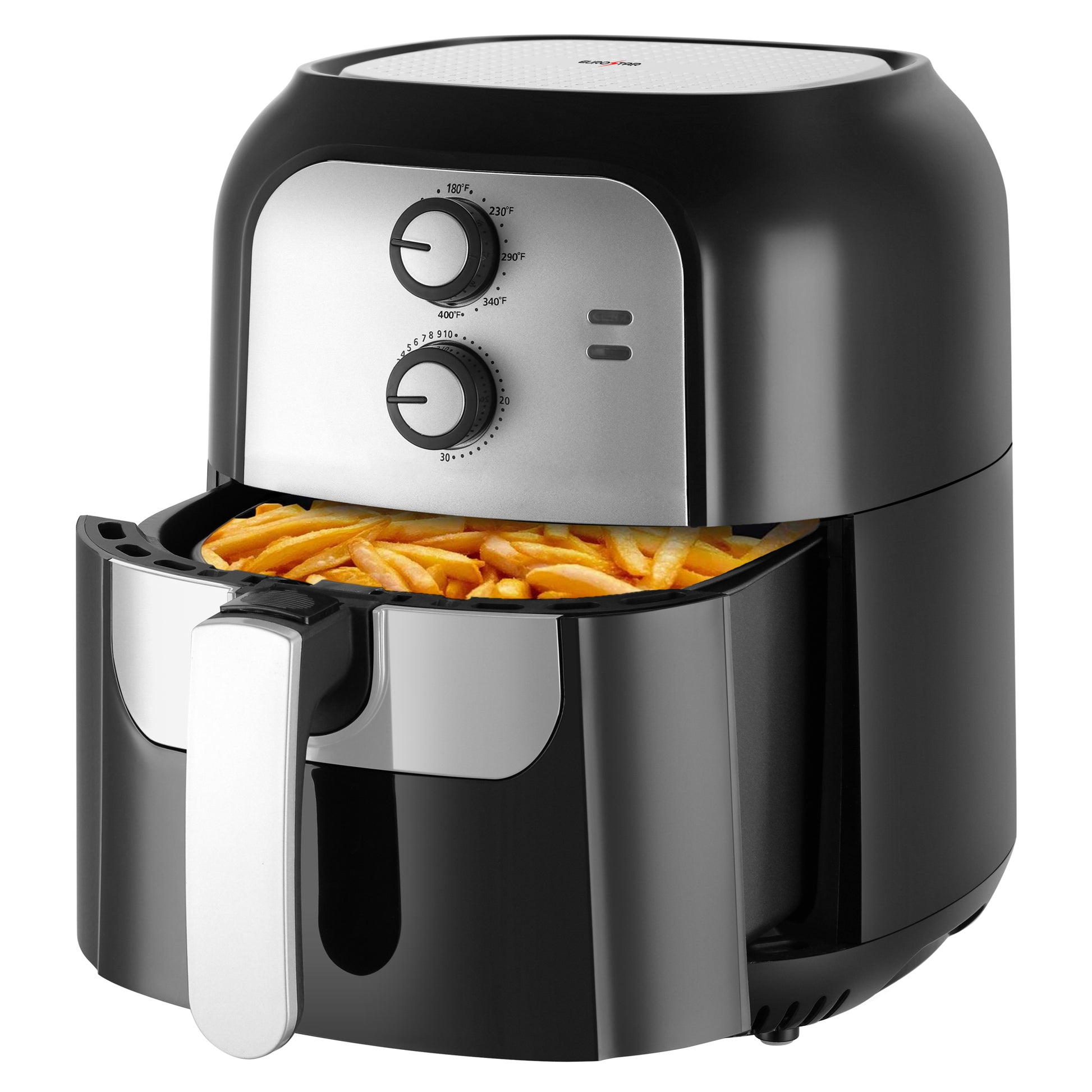 Enjoy delicious, crispy meals with less oil using the EUROSTAR 1400W Analog Air Fryer! Featuring powerful rapid air circulation technology, this fryer cooks food evenly with up to 85 percent less fat than traditional frying. The large 5.8 quart capacity is perfect for family-sized meals, while the easy-to-use analog controls let you adjust the temperature and time effortlessly. With a sleek design, non-stick basket, and easy cleanup, this air fryer is a must-have for quick, healthy, and tasty cooking. Fry, bake, grill, or roast - all in one appliance!