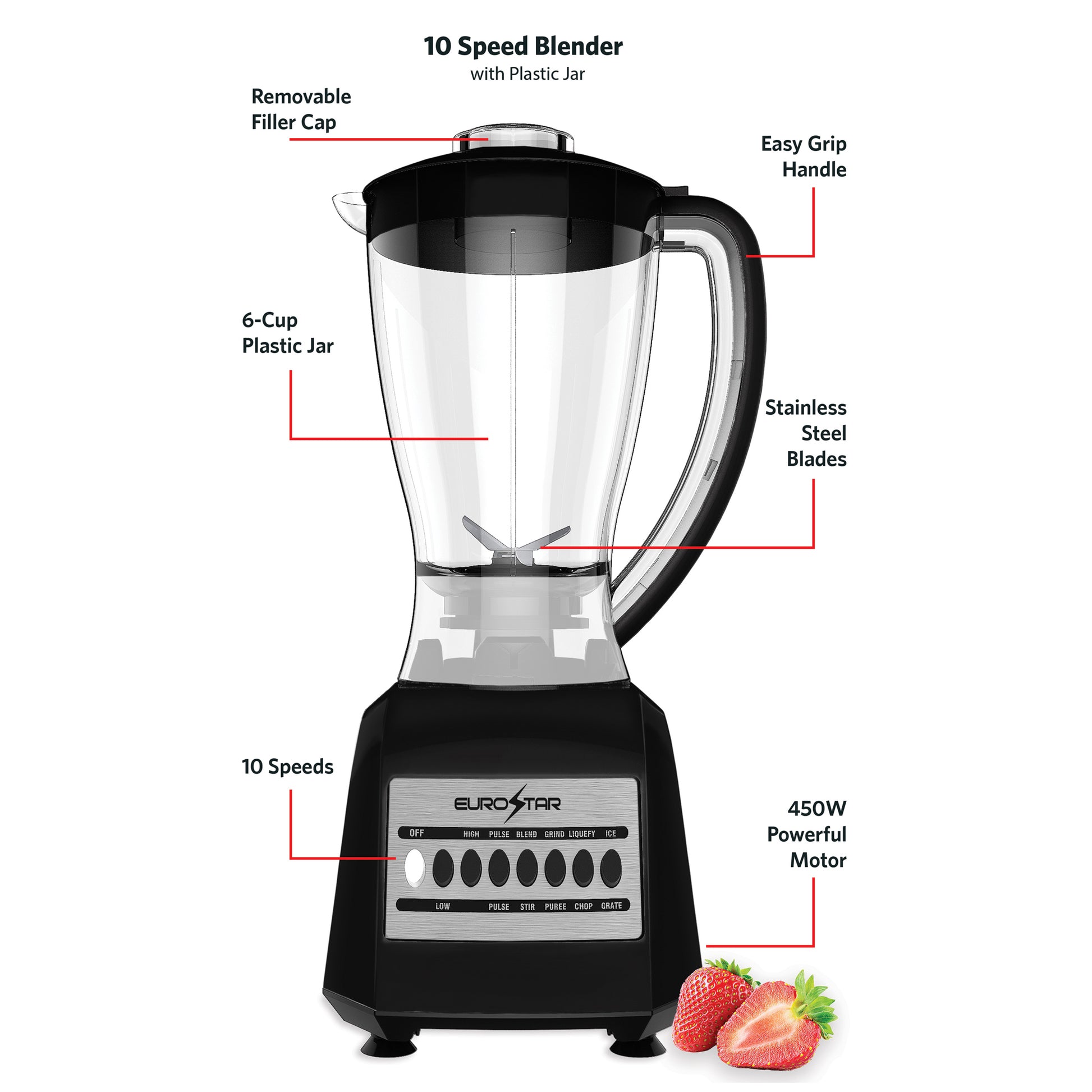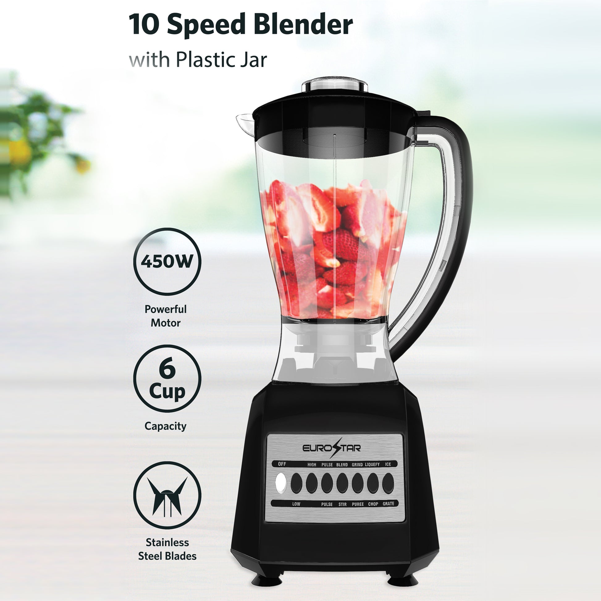 Upgrade your blender game with the EUROSTAR 10-Speed Blender! Featuring a powerful 450W motor, stainless steel blades, and a 6-cup capacity, it's perfect for everything from smoothies to soups. With 10-speed control and a removable filler cap, you get precision and convenience in every blend. Blend smoothies, soups, sauces, and more with ease using the EUROSTAR blender.
