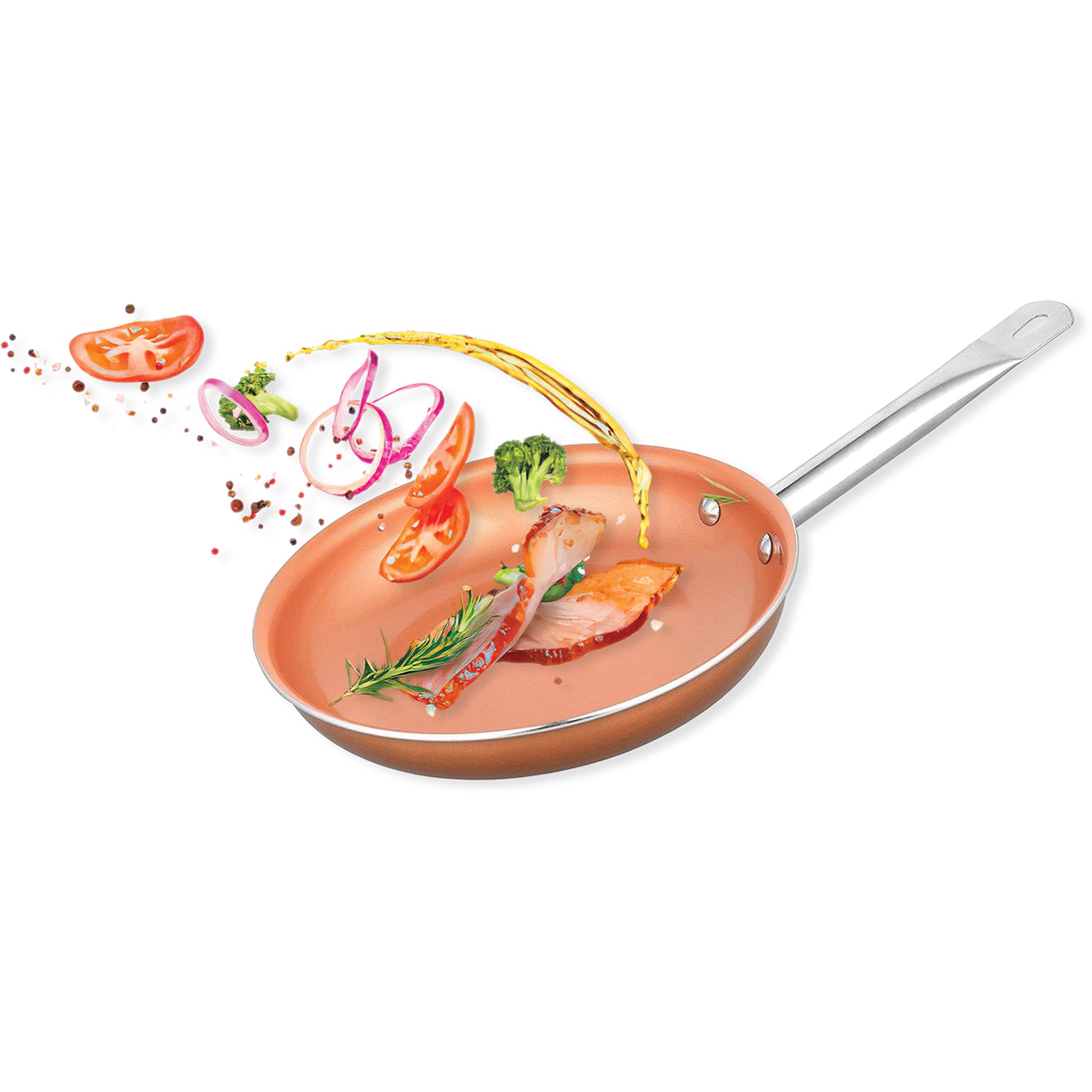 Upgrade your kitchen with the EUROSTAR 8-Inch Non-stick Ceramic-Infused Copper Fry Pan! Designed for even heat distribution and effortless food release, this pan features a durable copper-coated, ceramic-infused non-stick surface for healthier cooking with less oil. The sturdy, ergonomic handle provides a comfortable grip while the professional 3mm thick aluminum body provides better conductivity. Suitable for halogen, electric, ceramic, gas, and induction cooktops and oven safe up to 450 degrees. Perfect for eggs, sauteing veggies, searing meats, and more, this lightweight, easy-to-clean, and dishwasher safe fry pan is a must-have for any kitchen. Cook like a pro with EUROSTAR!
