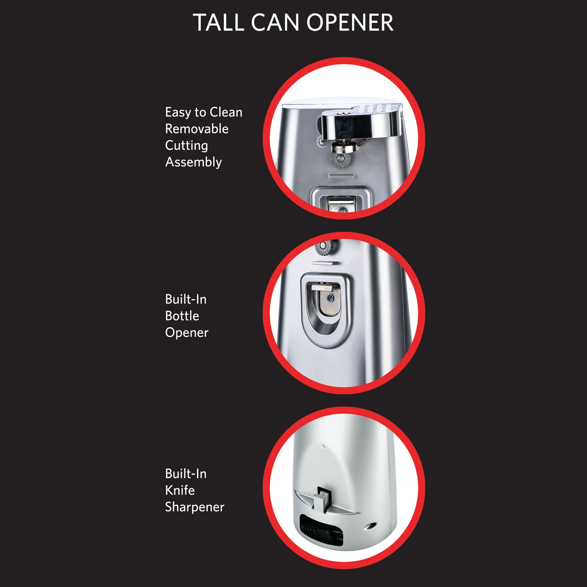 Curved, Tall Base - The curved body and stabilizing base have been optimized to easily open most can sizes.