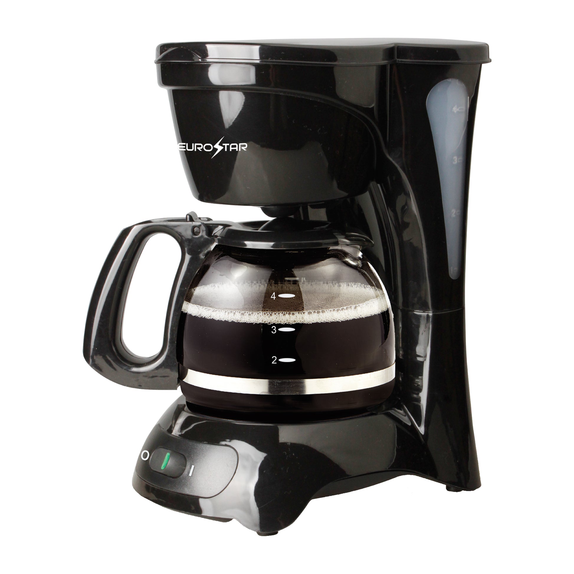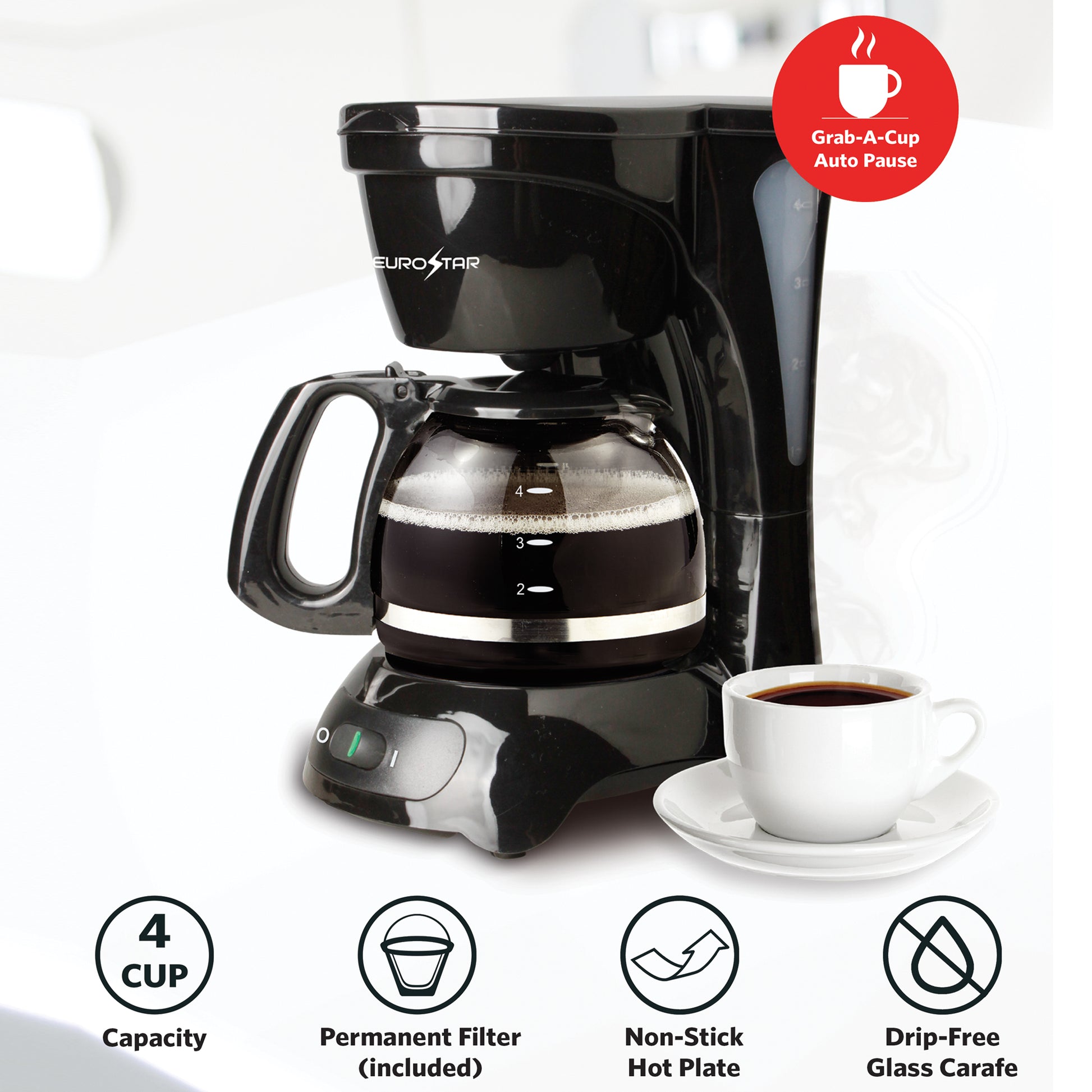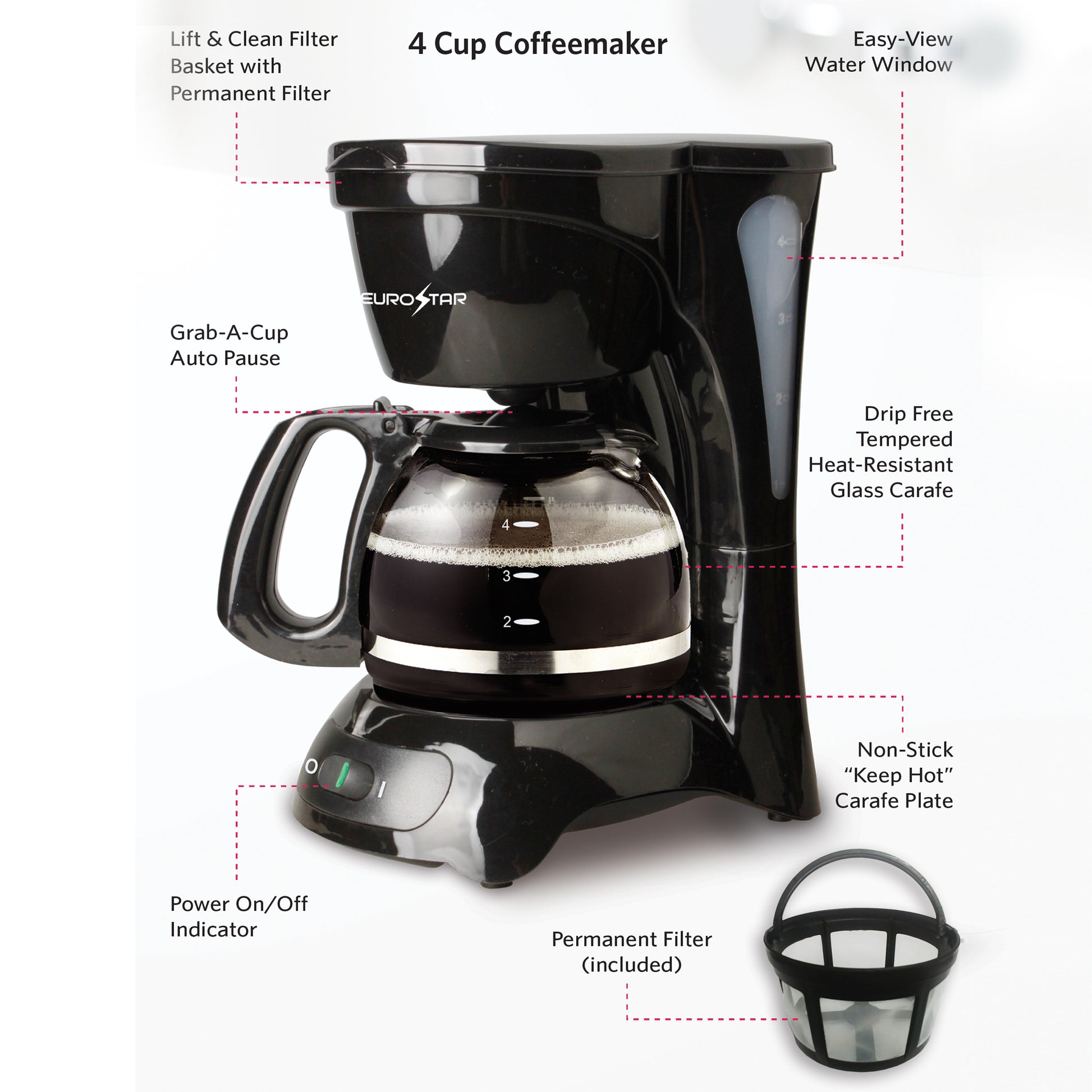The Eurostar 4-Cup Coffee Maker helps you make rich-tasting coffee without stress or mess. The Auto Pause is a lifesaver. It stops brewing so you can pour freely, and then finishes the brewing cycle after you place the carafe back in position. It also features a removable basket filter that lifts out for quick and easy filling and cleaning. Item Dimensions 8 x 7 x 10"es