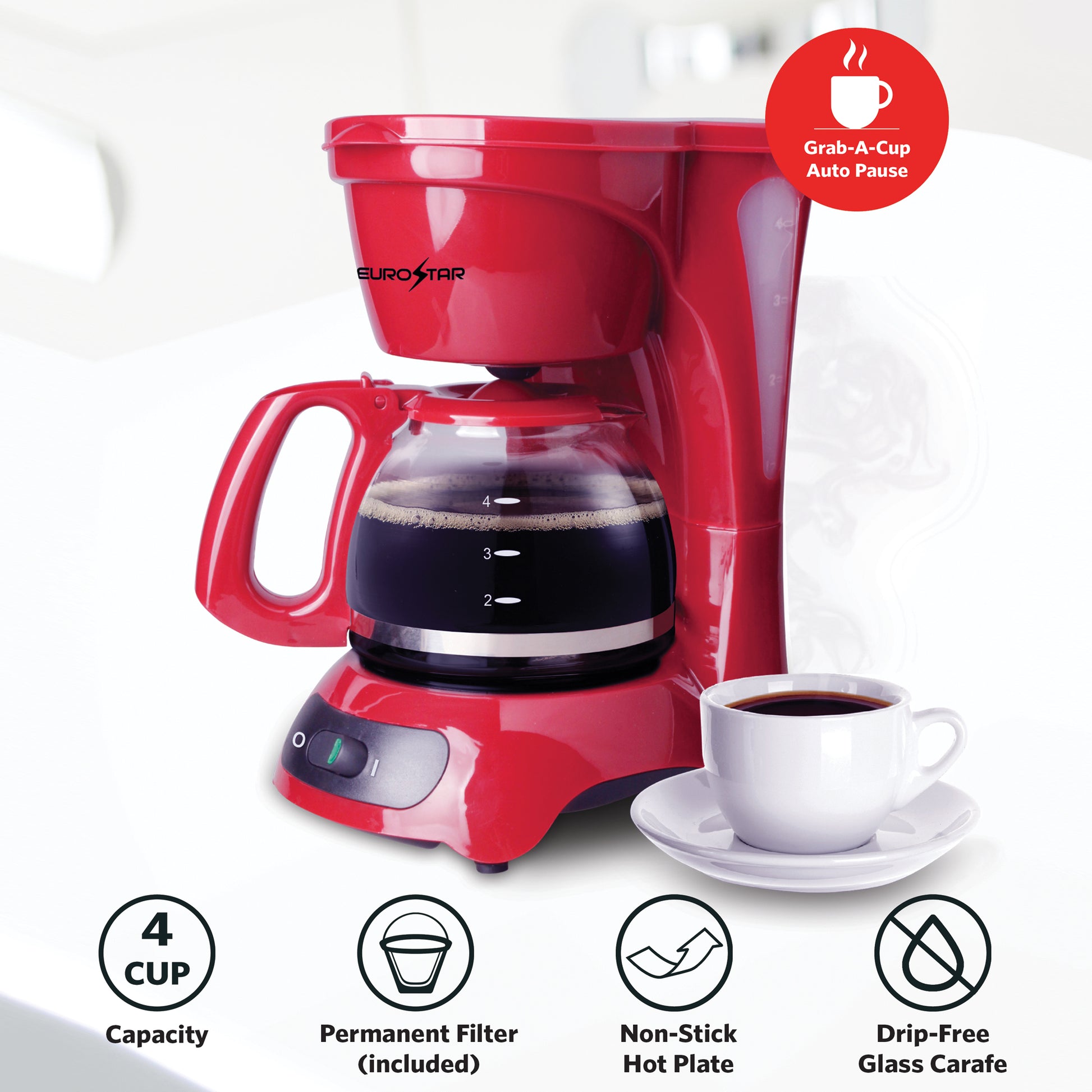 The Eurostar 4-Cup Coffee Maker helps you make rich-tasting coffee without stress or mess. The Auto Pause is a lifesaver. It stops brewing so you can pour freely, and then finishes the brewing cycle after you place the carafe back in position. It also features a removable basket filter that lifts out for quick and easy filling and cleaning.