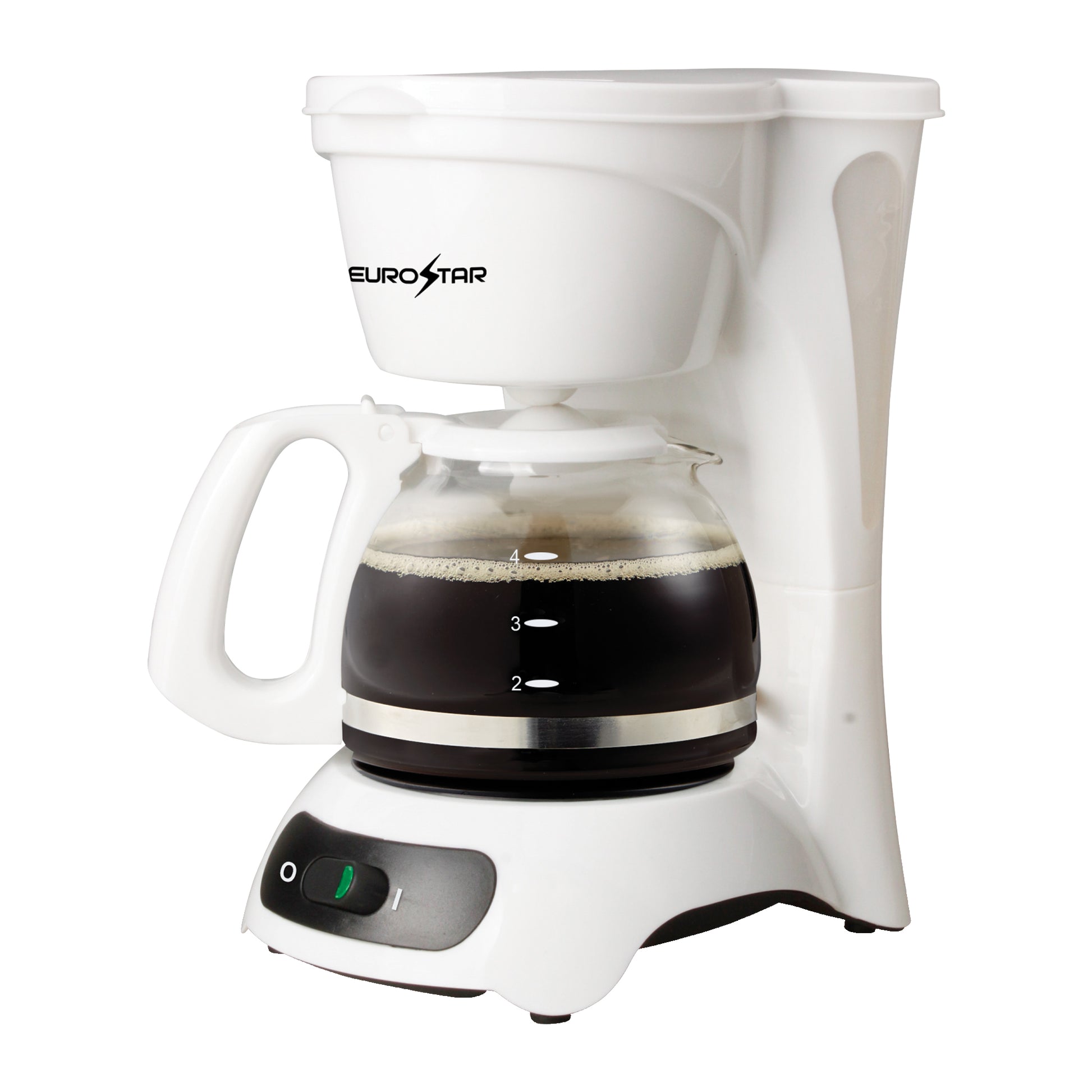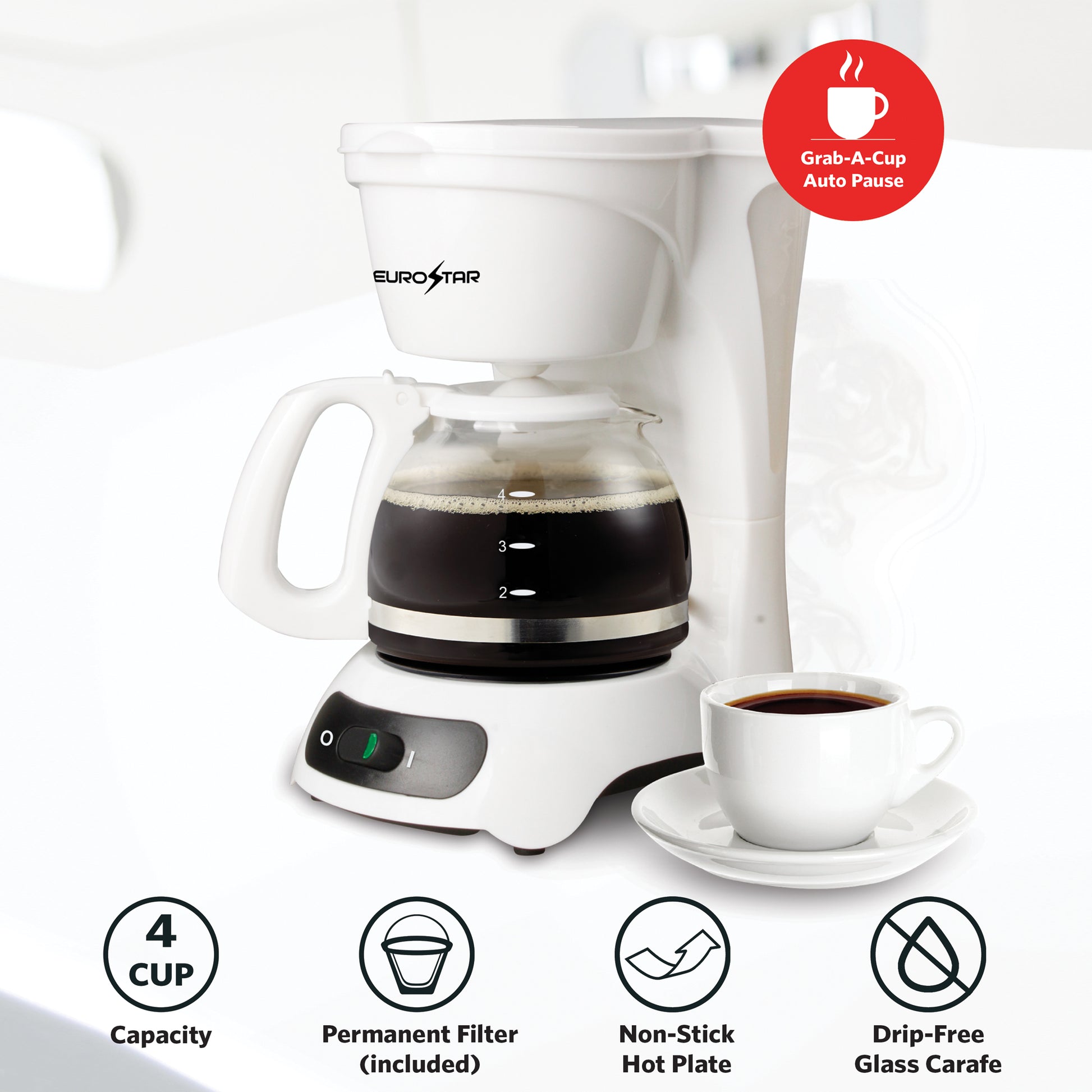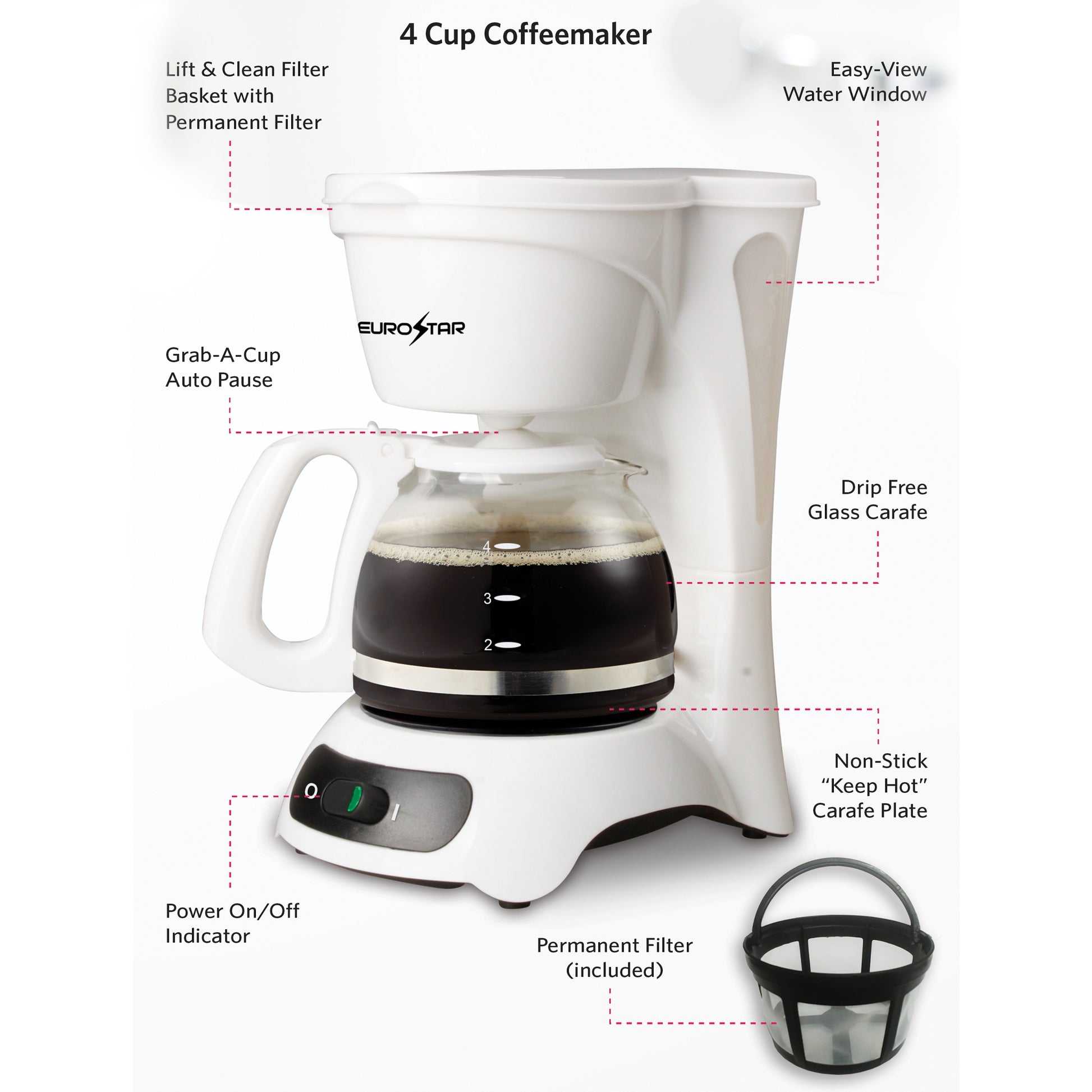 The Eurostar 4-Cup Coffee Maker helps you make rich-tasting coffee without stress or mess. The Auto Pause is a lifesaver. It stops brewing so you can pour freely, and then finishes the brewing cycle after you place the carafe back in position. It also features a removable basket filter that lifts out for quick and easy filling and cleaning.