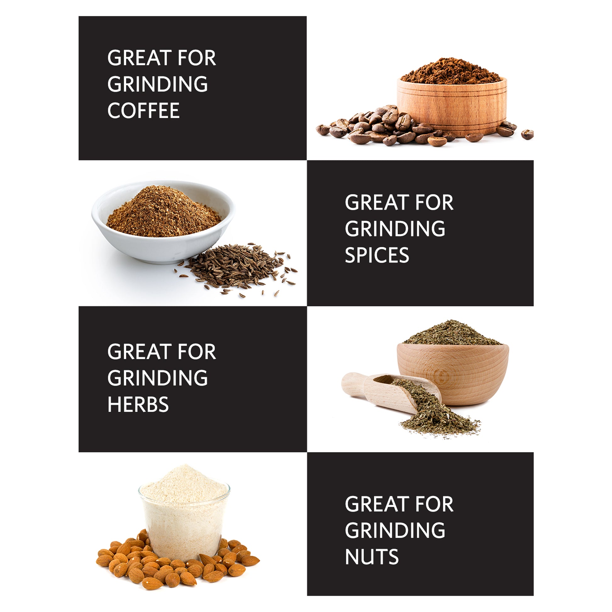 Durable stainless steel blades. Perfectly grinds coffee beans, nuts, herbs and spices.