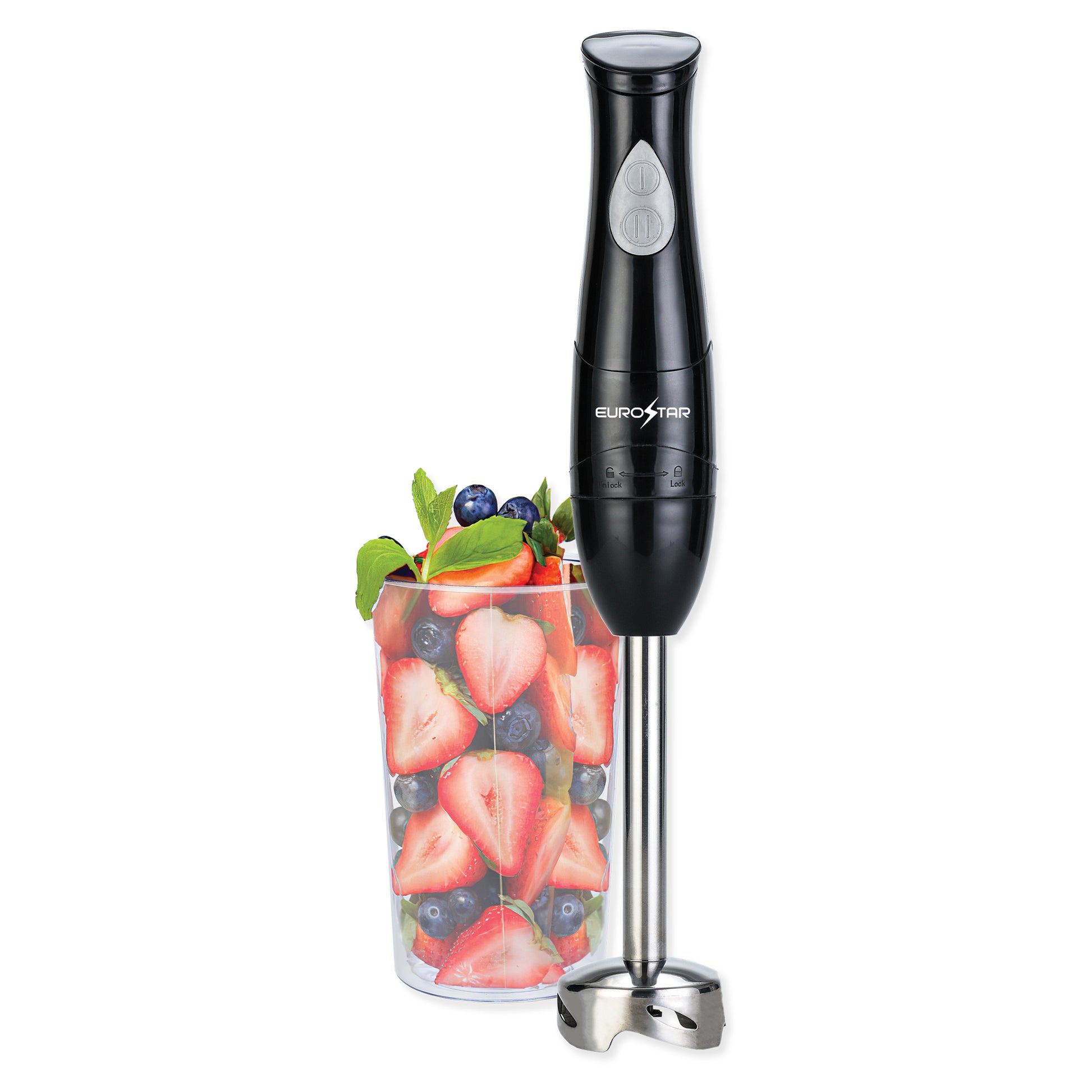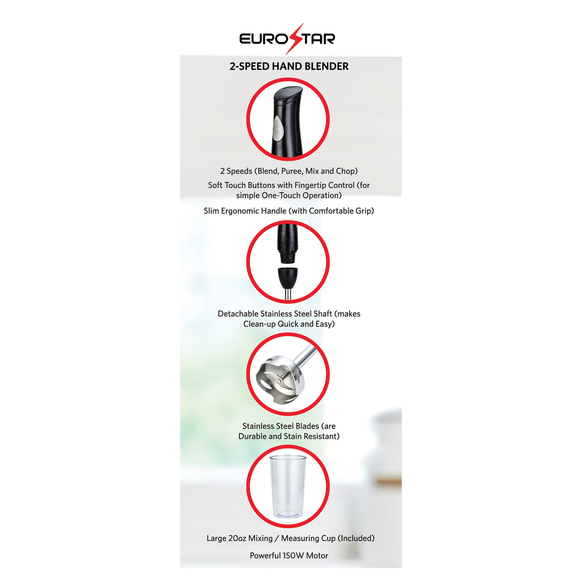 EUROSTAR 2-Speed Hand Blender with Stainless Steel Detachable Shaft. It makes blending and mixing any soft foods a pleasure because it makes it so easy and effortless. Its lightweight body along with its ergonomically-designed non-slip handle is so comfortable to hold and control. Whip up all of your favorite gourmet soups, guacamole, smoothies/shakes, cake batter, salsas, sauces, marinades, salad dressings with just one press of a button.