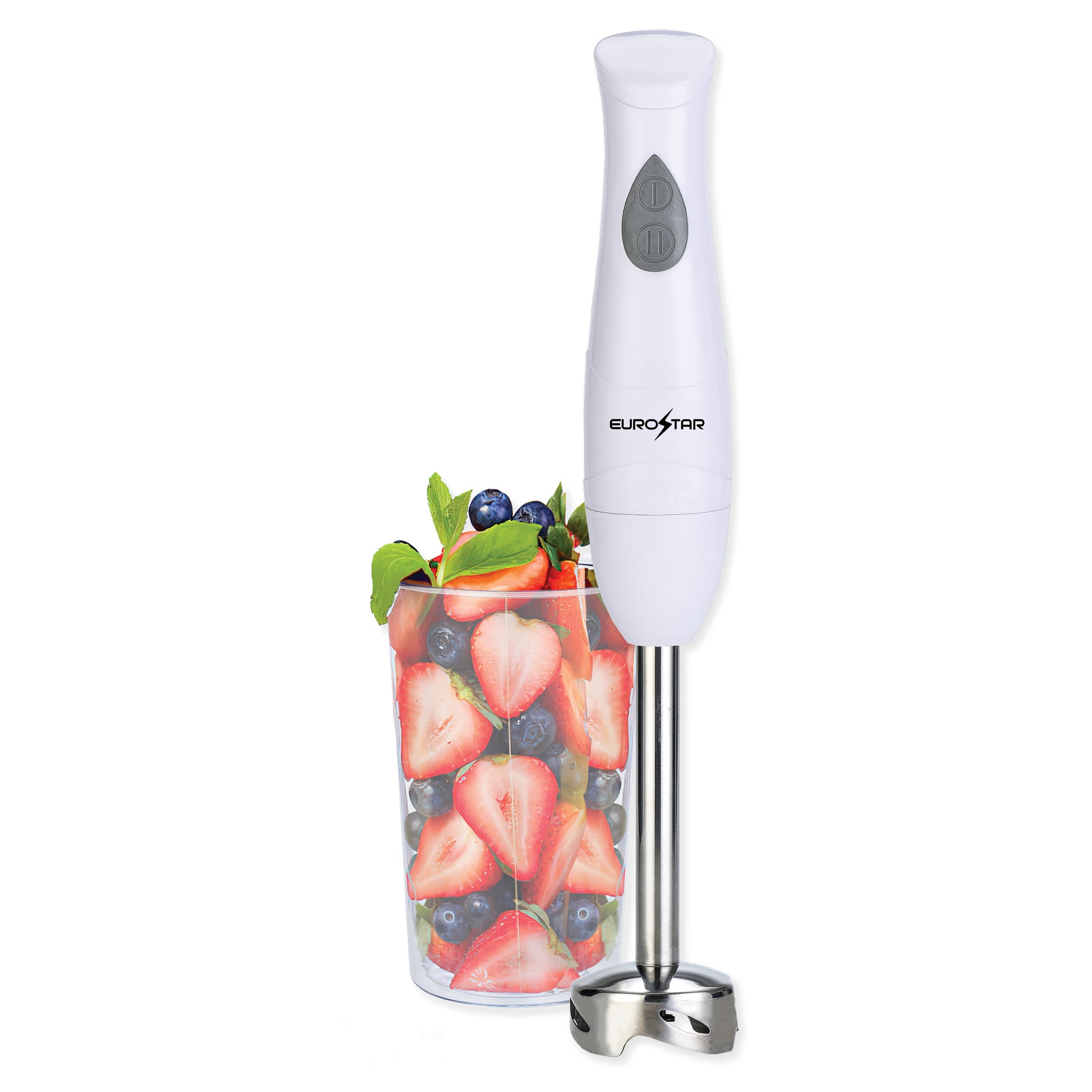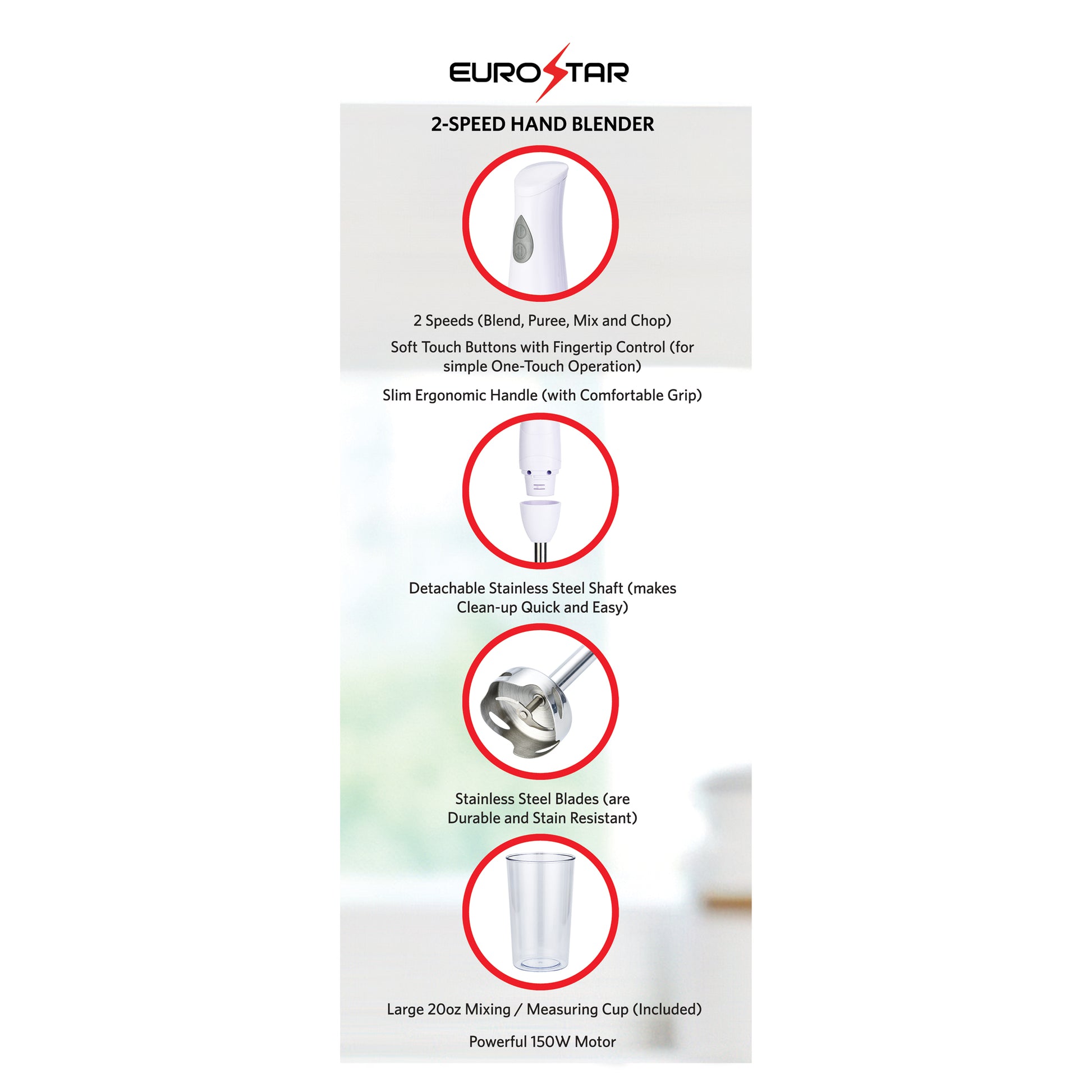 EUROSTAR 2-Speed Hand Blender with Stainless Steel Detachable Shaft. It makes blending and mixing any soft foods a pleasure because it makes it so easy and effortless. Its lightweight body along with its ergonomically-designed non-slip handle is so comfortable to hold and control. Whip up all of your favorite gourmet soups, guacamole, smoothies/shakes, cake batter, salsas, sauces, marinades, salad dressings with just one press of a button.