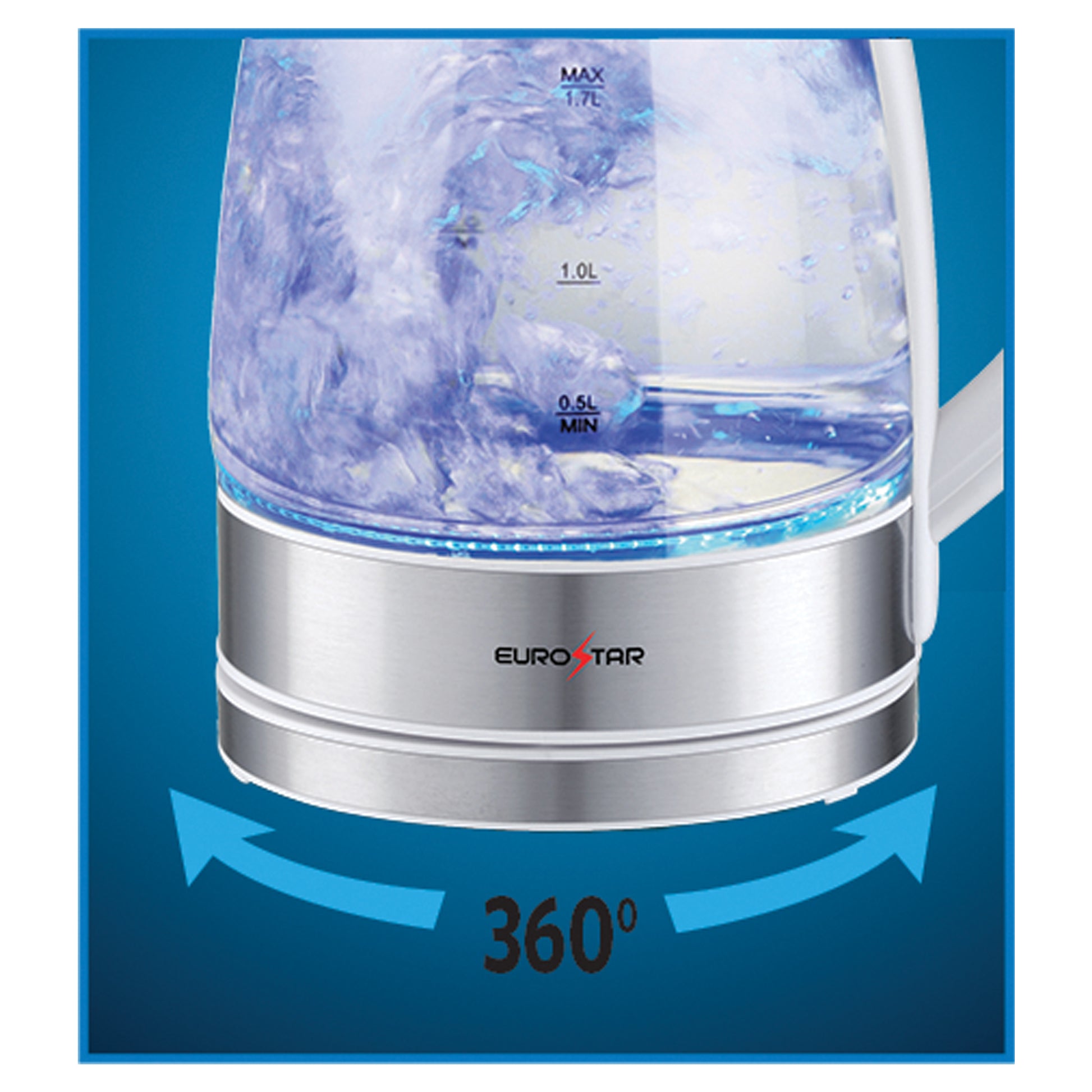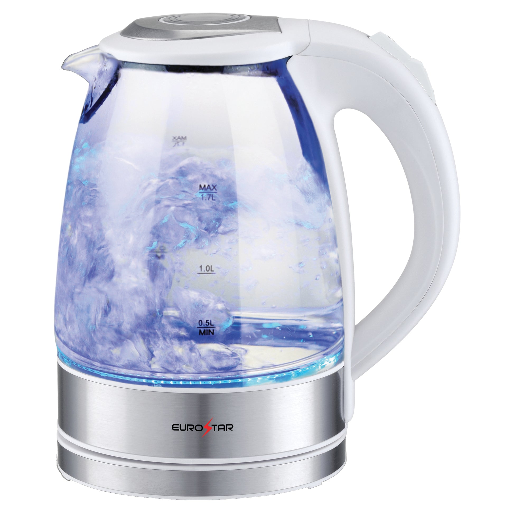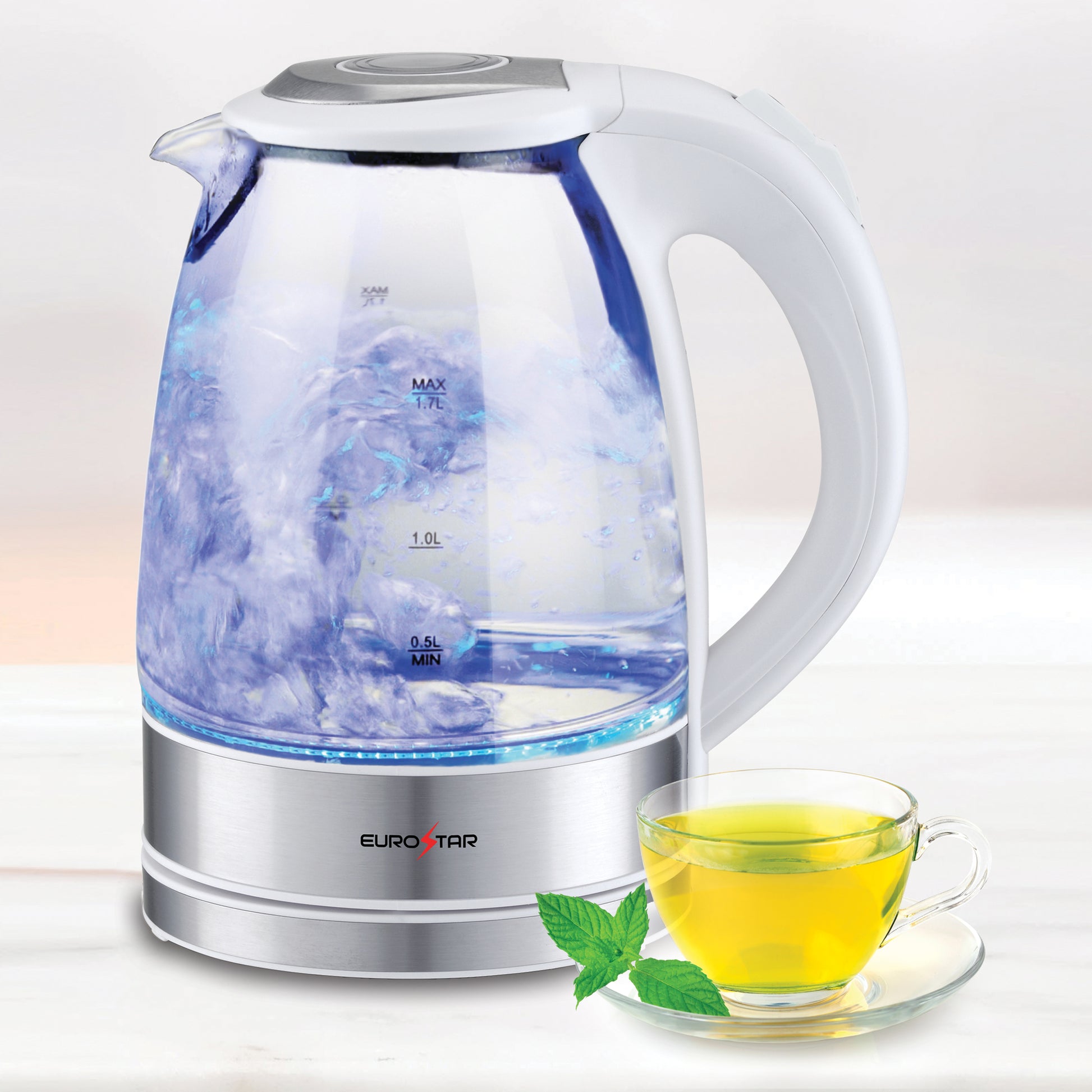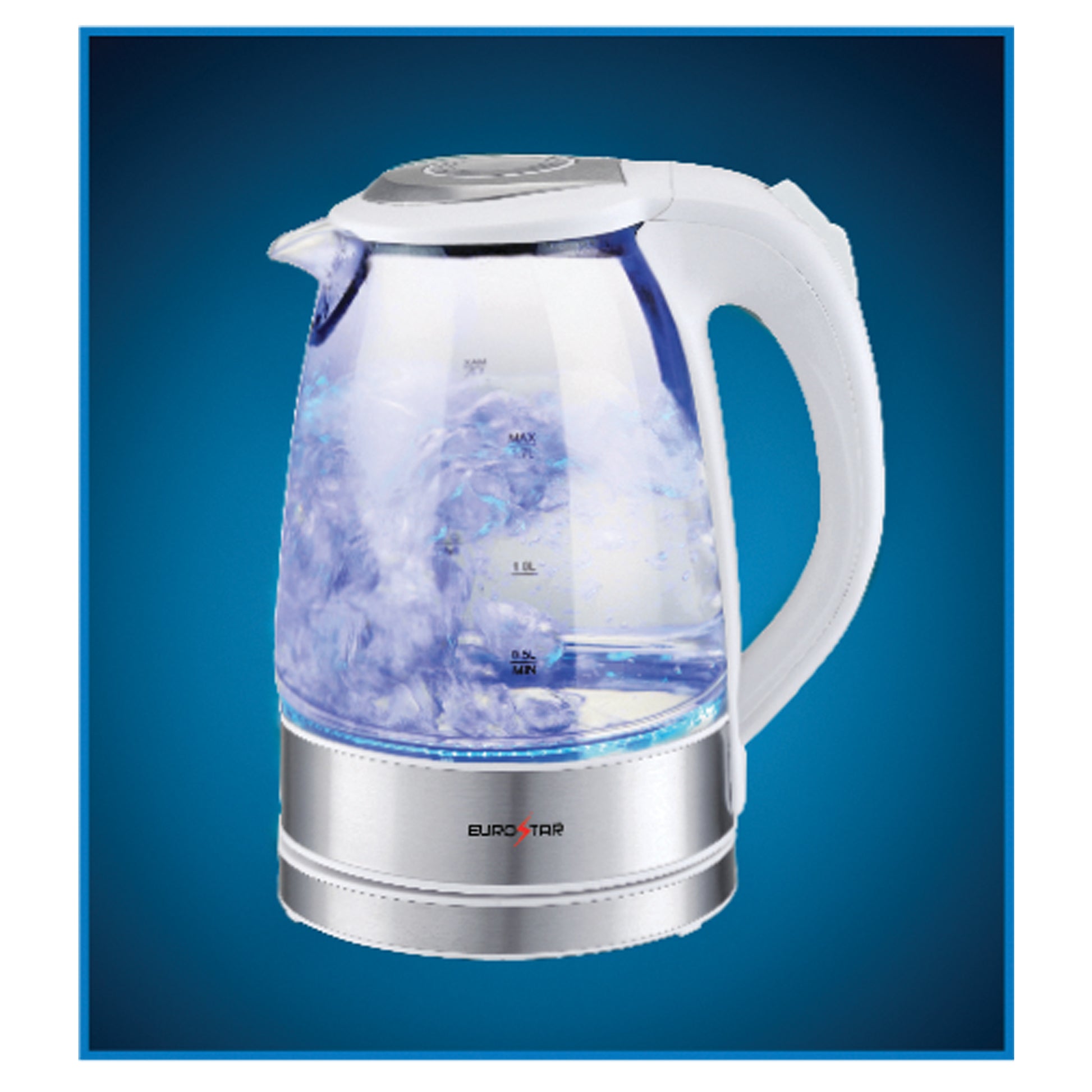 Upgrade your kitchen with the sleek and powerful 1100W EUROSTAR 1.7-Liter Stainless Steel Glass Electric Kettle, designed for fast boiling, safety, and convenience. The cordless serving design and 360 degree swivel power base making pouring effortless, while the blue LED power indicator adds a stylish touch. The push-button lid and cool-touch handle ensure easy and safe operation, and built-in boil-dry protection and auto shutoff provide peace of mind. Perfect for tea, coffee, oatmeal, and more.
