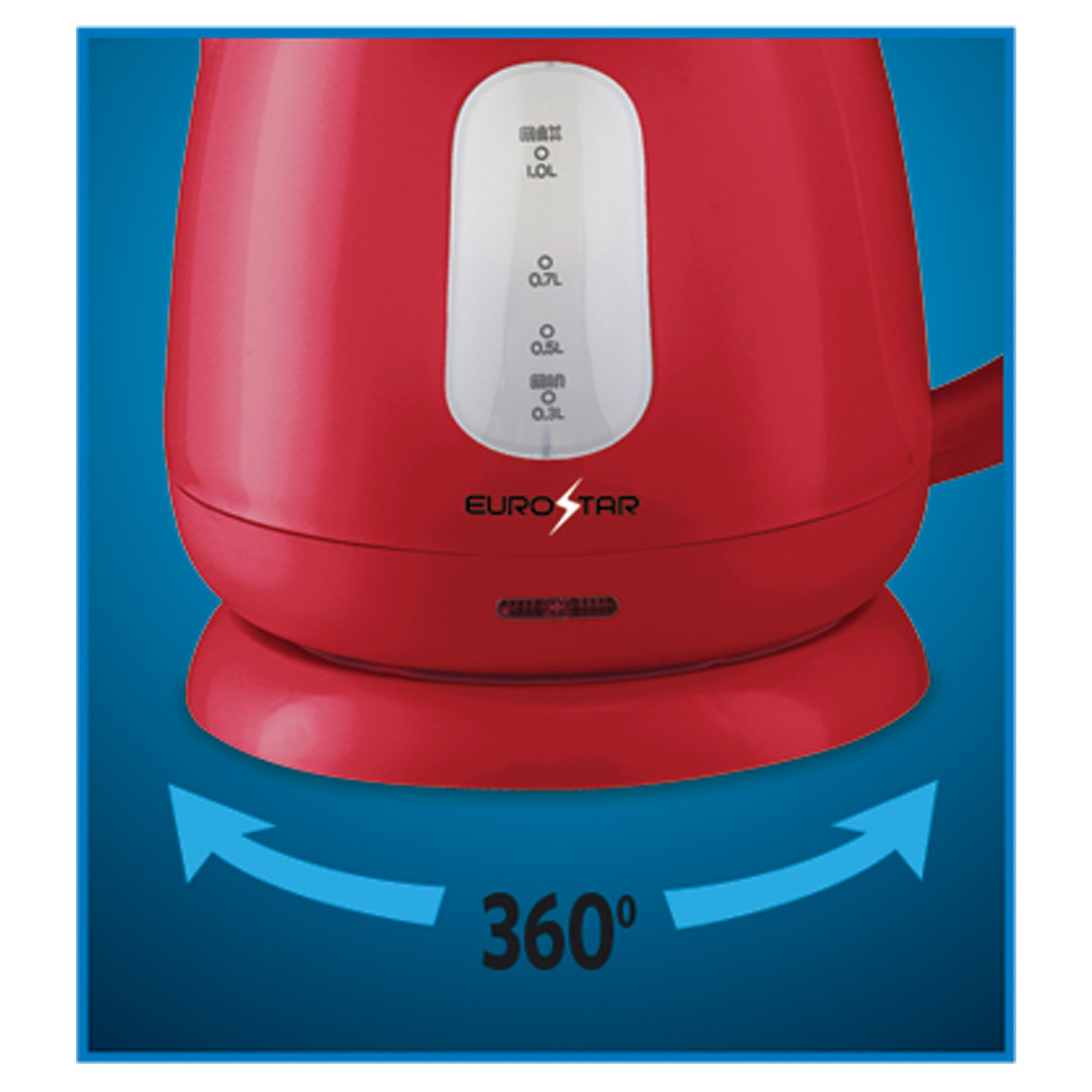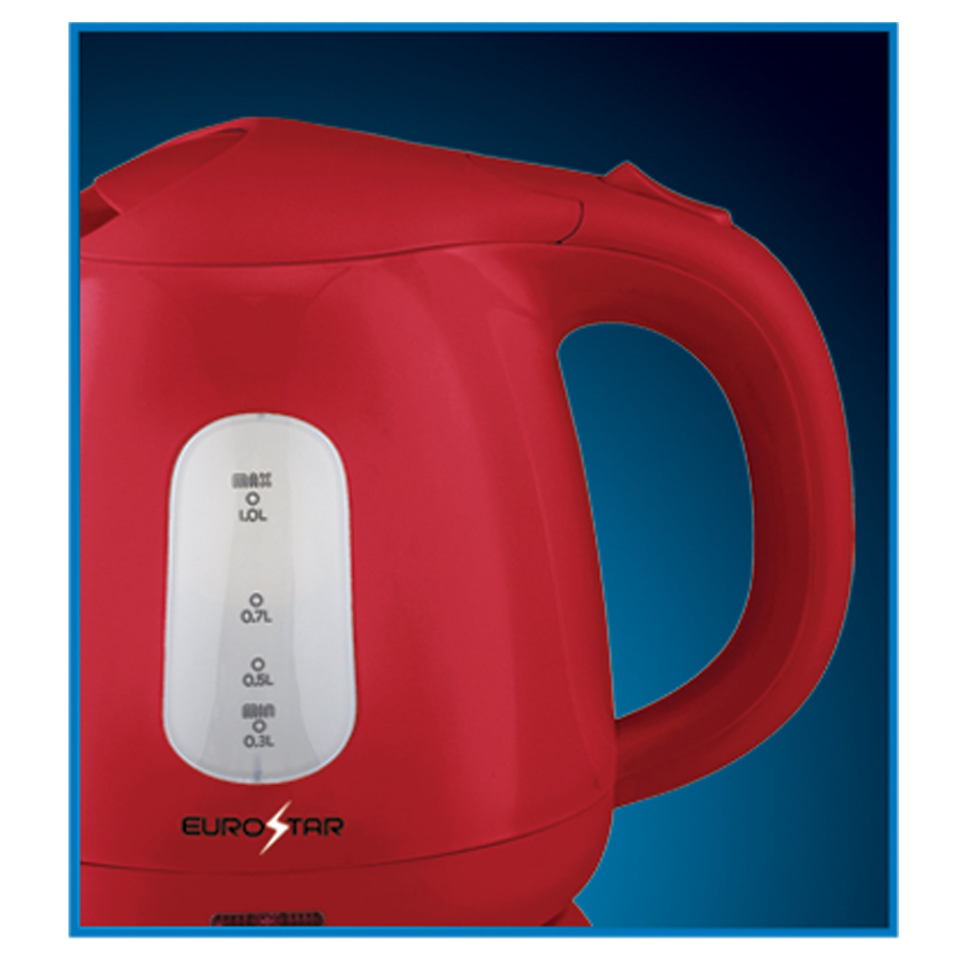 Enjoy fast and efficient boiling with the EUROSTAR 1-Liter 1100-Watt Electric Kettle, designed for small spaces and big convenience. Its compact design is perfect for kitchens, offices and dorms, while cordless serving and a 360 degree swivel power base provide hassle-free handling. The water level mark on both sides ensures easy measuring, and the ergonomic handle offers a comfortable grip. Featuring a concealed stainless steel heating element, removable/washable dirt & scale filter, and essential safety features like a lid safety lock, boil-dry protection, and automatic shut-off, this kettle is built for performance and peace of mind.