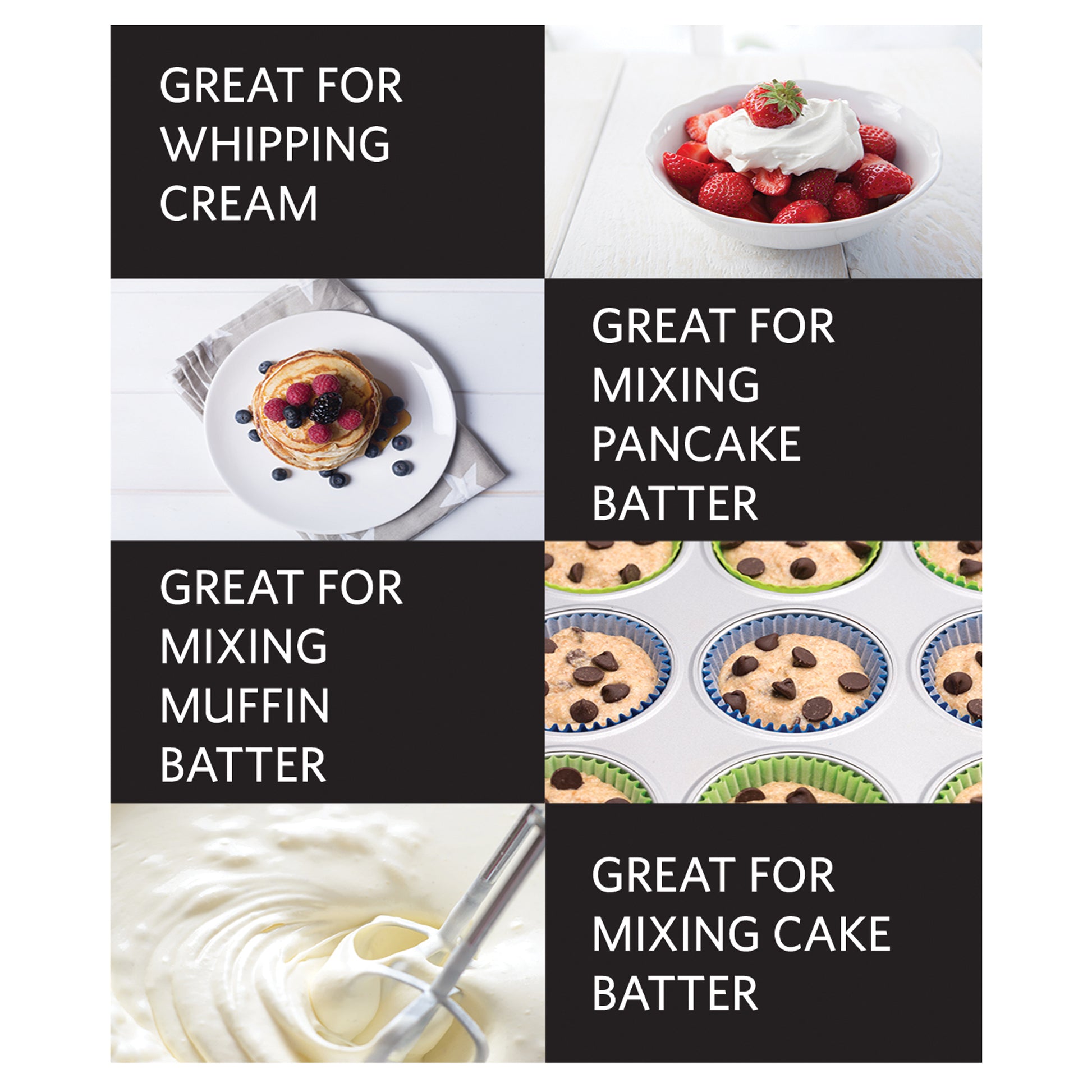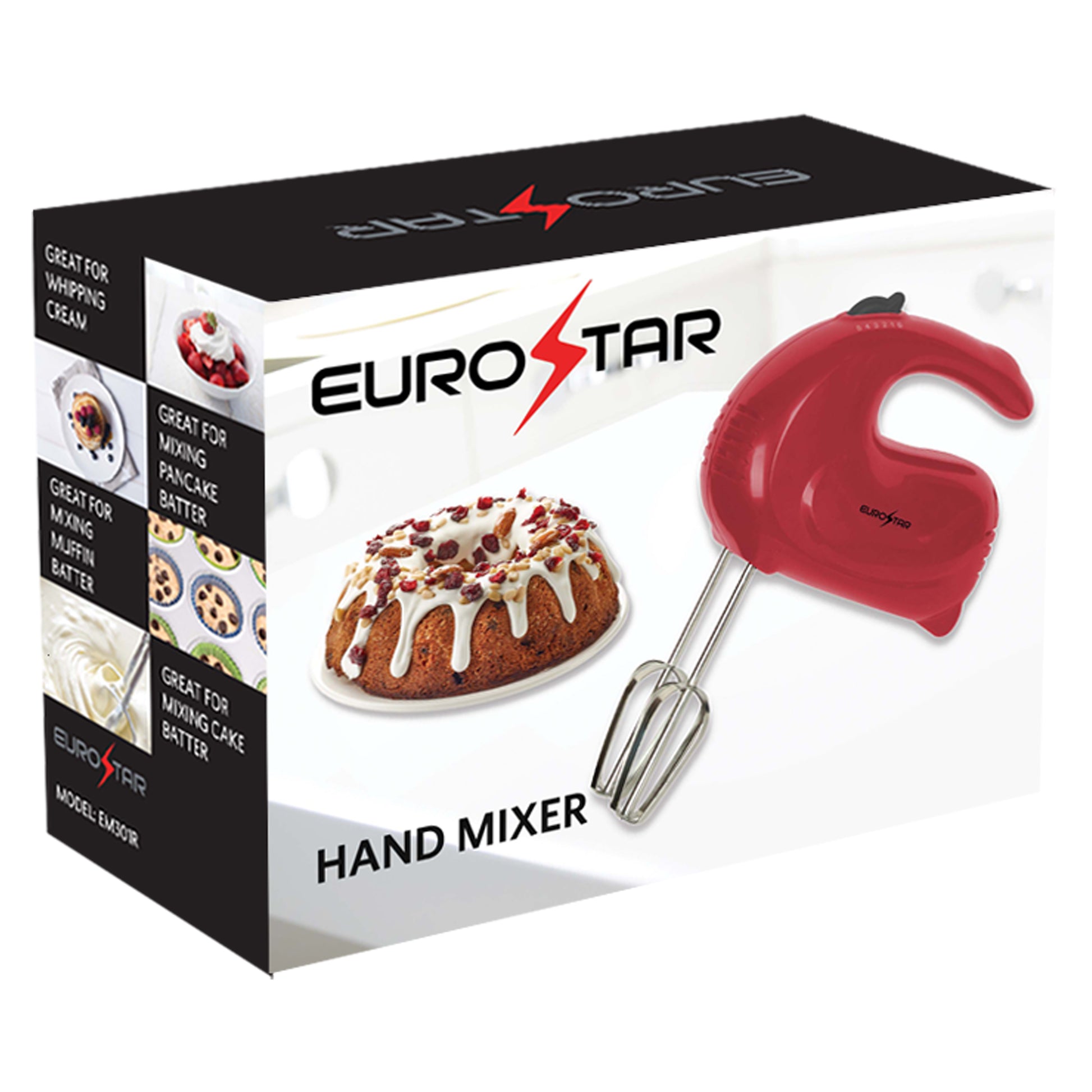 Effortless Mixing at your fingertips! Whip up your favorite recipes with ease using the EUROSTAR 150-Watt 5-Speed Hand Mixer. Designed for versatility, it features a one touch slide control to seamlessly adjust speeds, ensuring perfect consistency for every mix. The stainless steel beaters provide durability and efficiency, while the ergonomic handle ensures a comfortable grip for effortless use. Whether you're mixing batter, whipping cream, or beating eggs, this hand mixer makes kitchen prep a breeze.