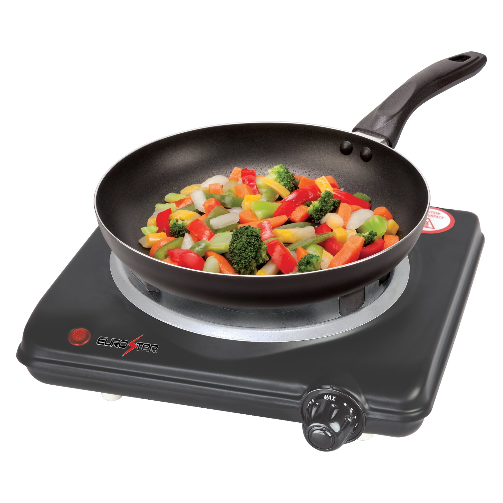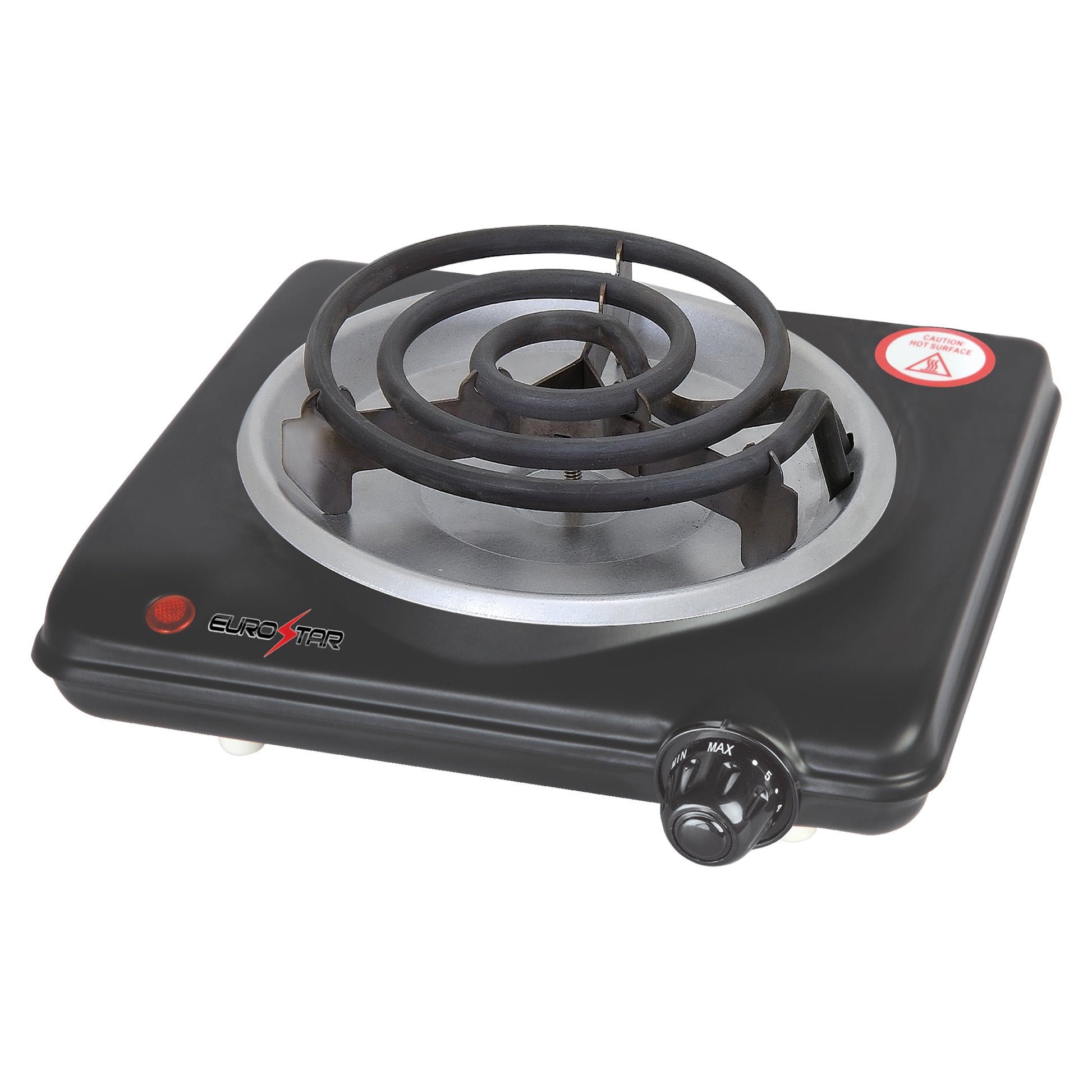 The EUROSTAR 1000-Watt Single Burner with Spiral Plates is the ideal solution for cooking in small spaces. Whether you're in a dorm, office, RV, or need an extra burner at home, this portable electric hot plate delivers fast, efficient heating. Designed for convenience, it features an adjustable temperature control, power indicator light, and non-skid rubber feet for stability. The 5.12" heating plate accommodates various cookware, making it a versatile addition to any kitchen.