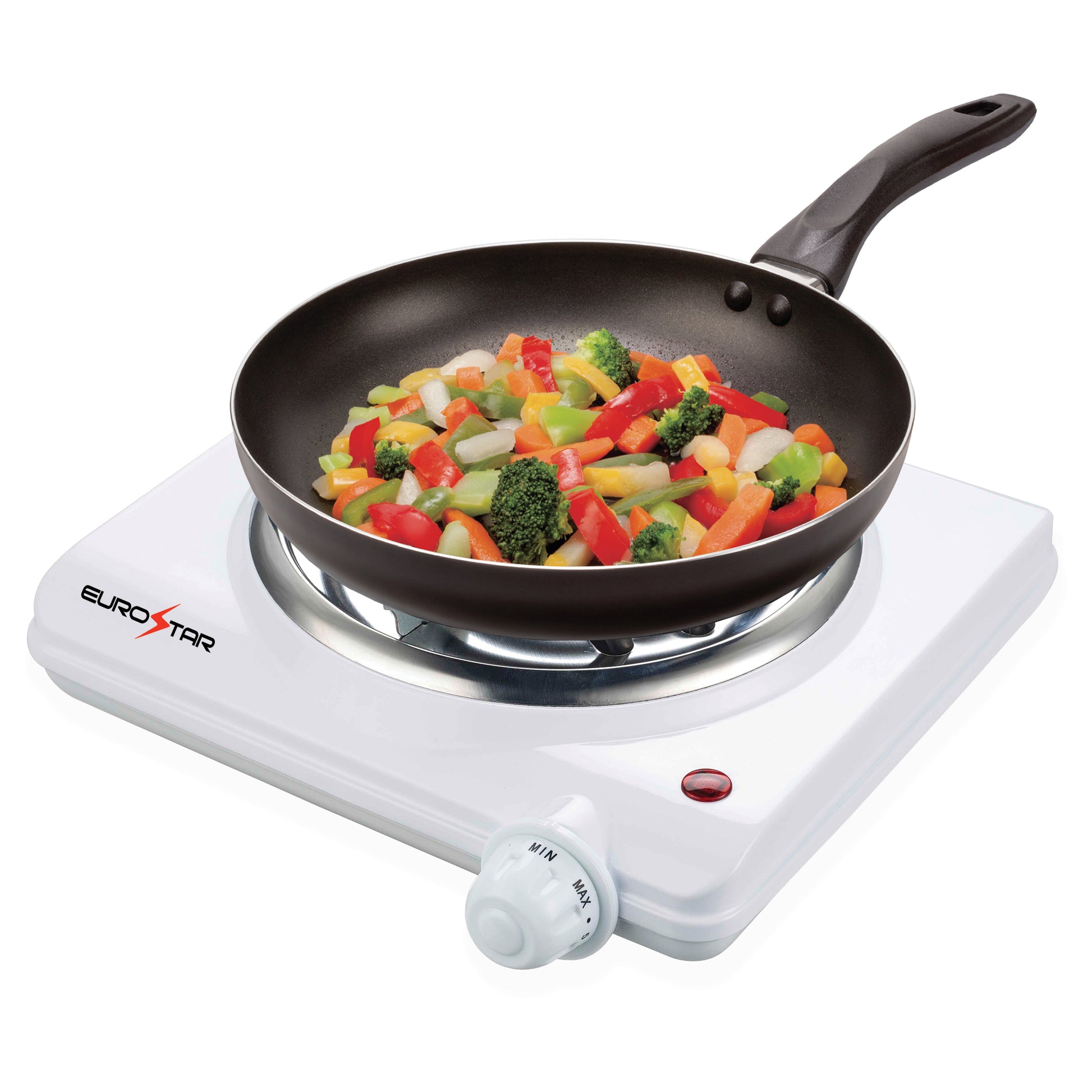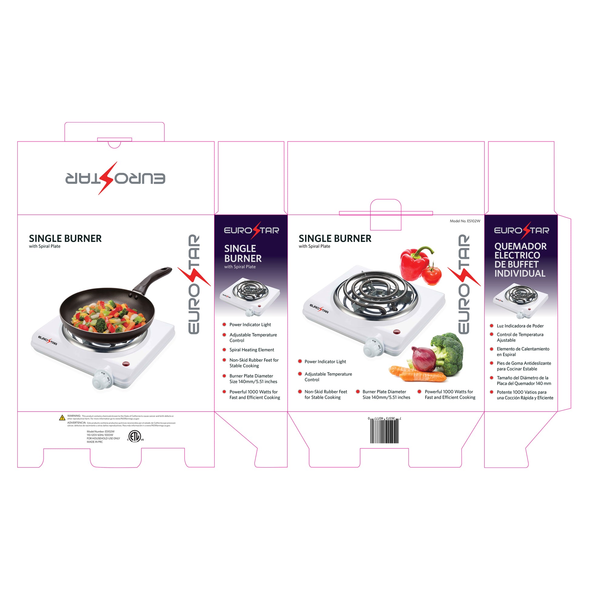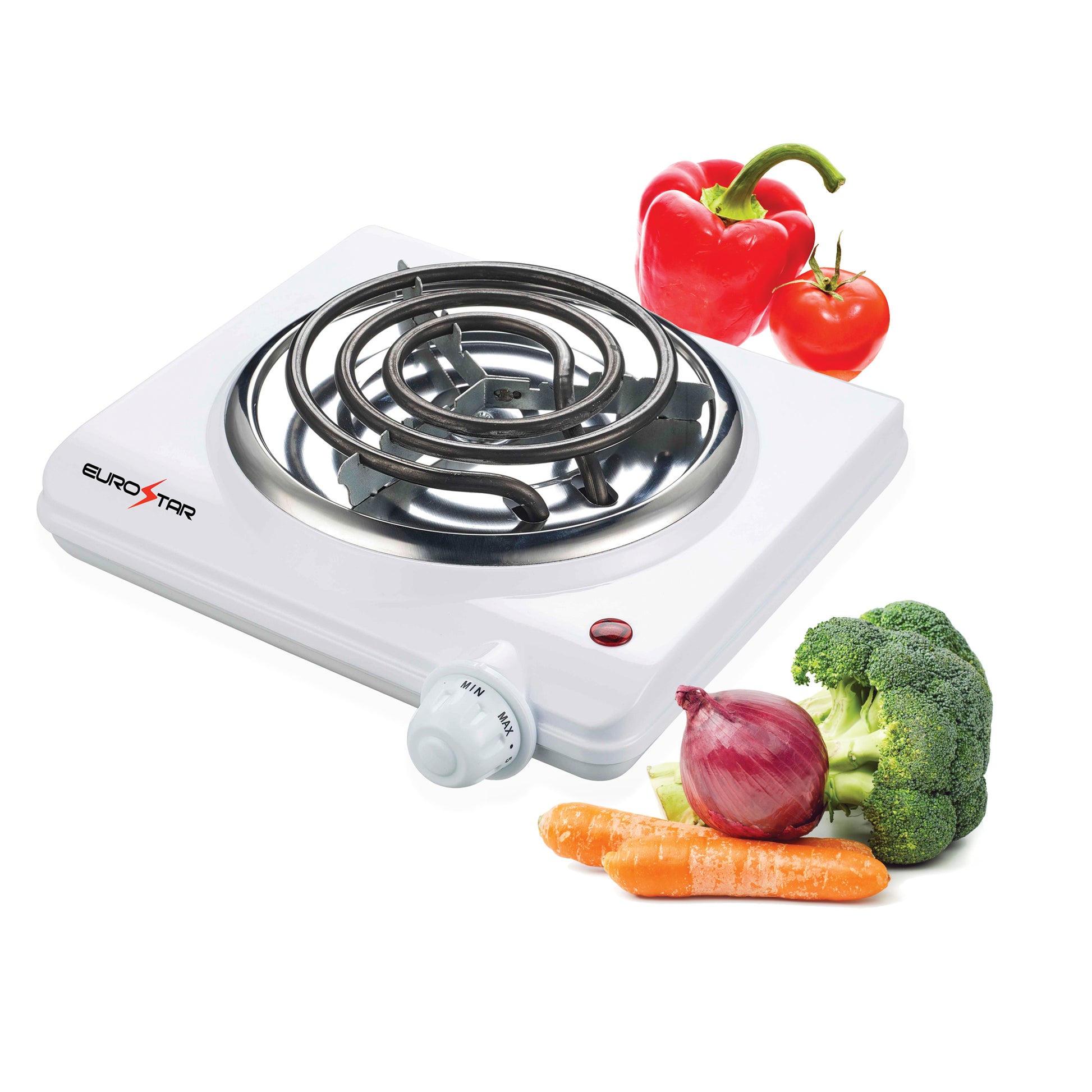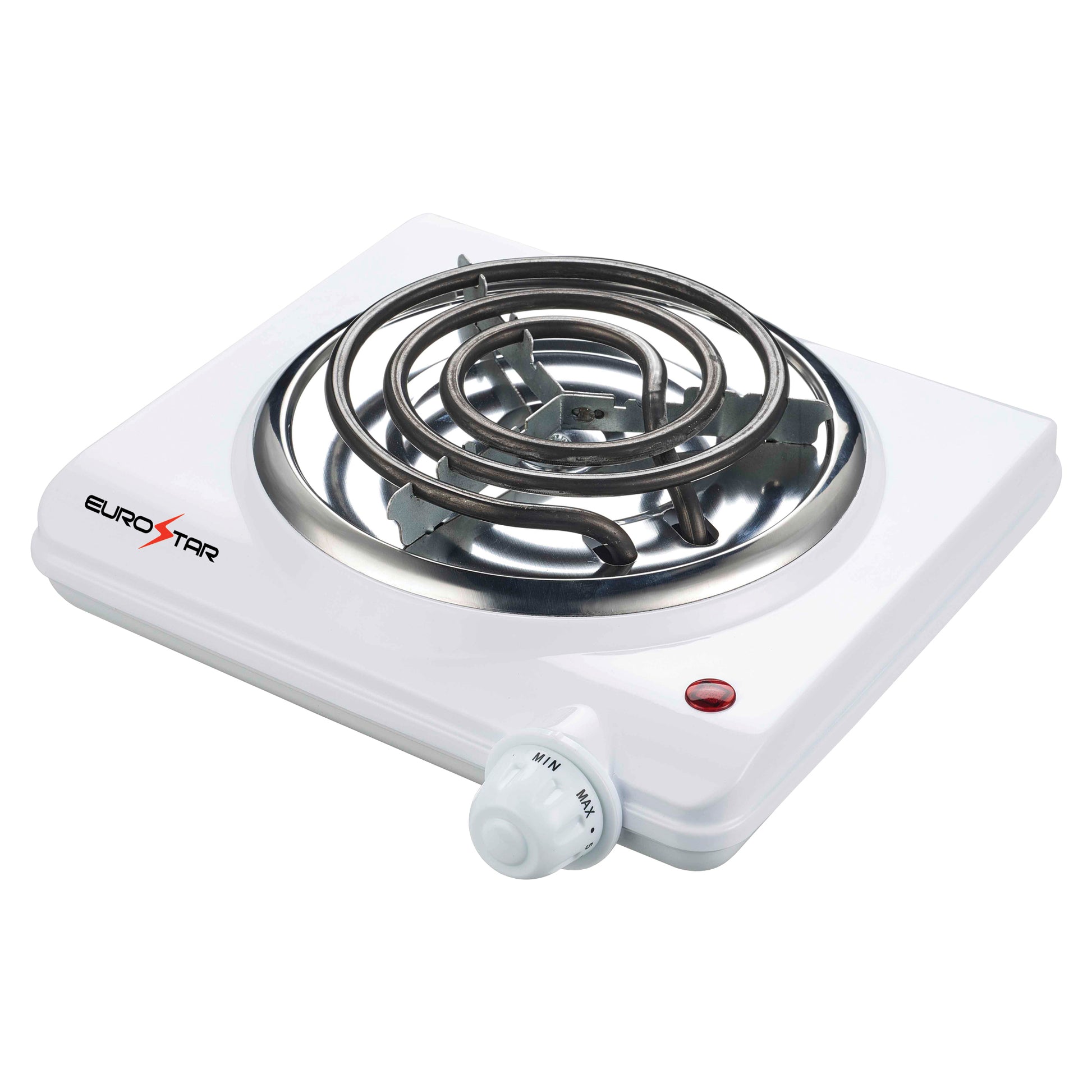 The EUROSTAR 1000-Watt Single Burner with Spiral Plates is the ideal solution for cooking in small spaces. Whether you're in a dorm, office, RV, or need an extra burner at home, this portable electric hot plate delivers fast, efficient heating. Designed for convenience, it features an adjustable temperature control, power indicator light, and non-skid rubber feet for stability. The 5.12" heating plate accommodates various cookware, making it a versatile addition to any kitchen.