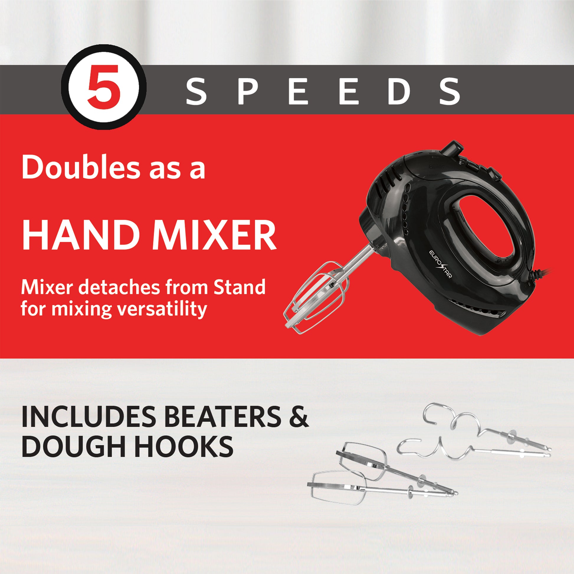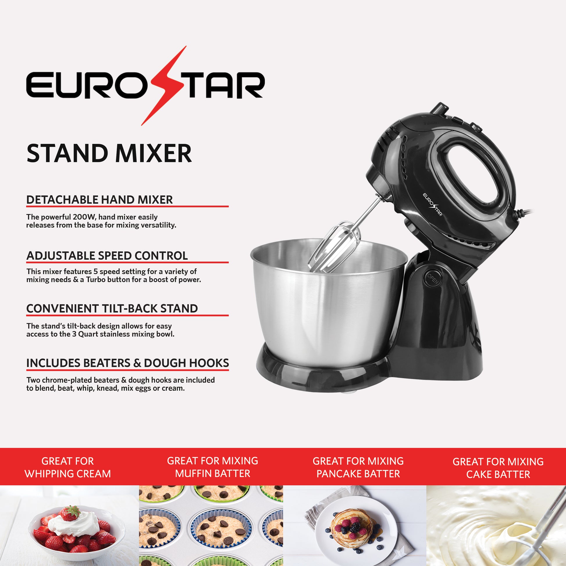 Upgrade your baking experience with the EUROSTAR Stand Mixer, designed for convenience and versatility. Whether you're whipping up fluffy cakes, kneading dough, or mixing batter, the adjustable speed control ensures precision for any recipe. The tilt-back stand allows easy access to the mixing bowl, while the detachable hand mixer offers flexibility for quick tasks. With included beaters and dough hooks, this mixer is the perfect addition to any kitchen. Get ready to bake like a pro!