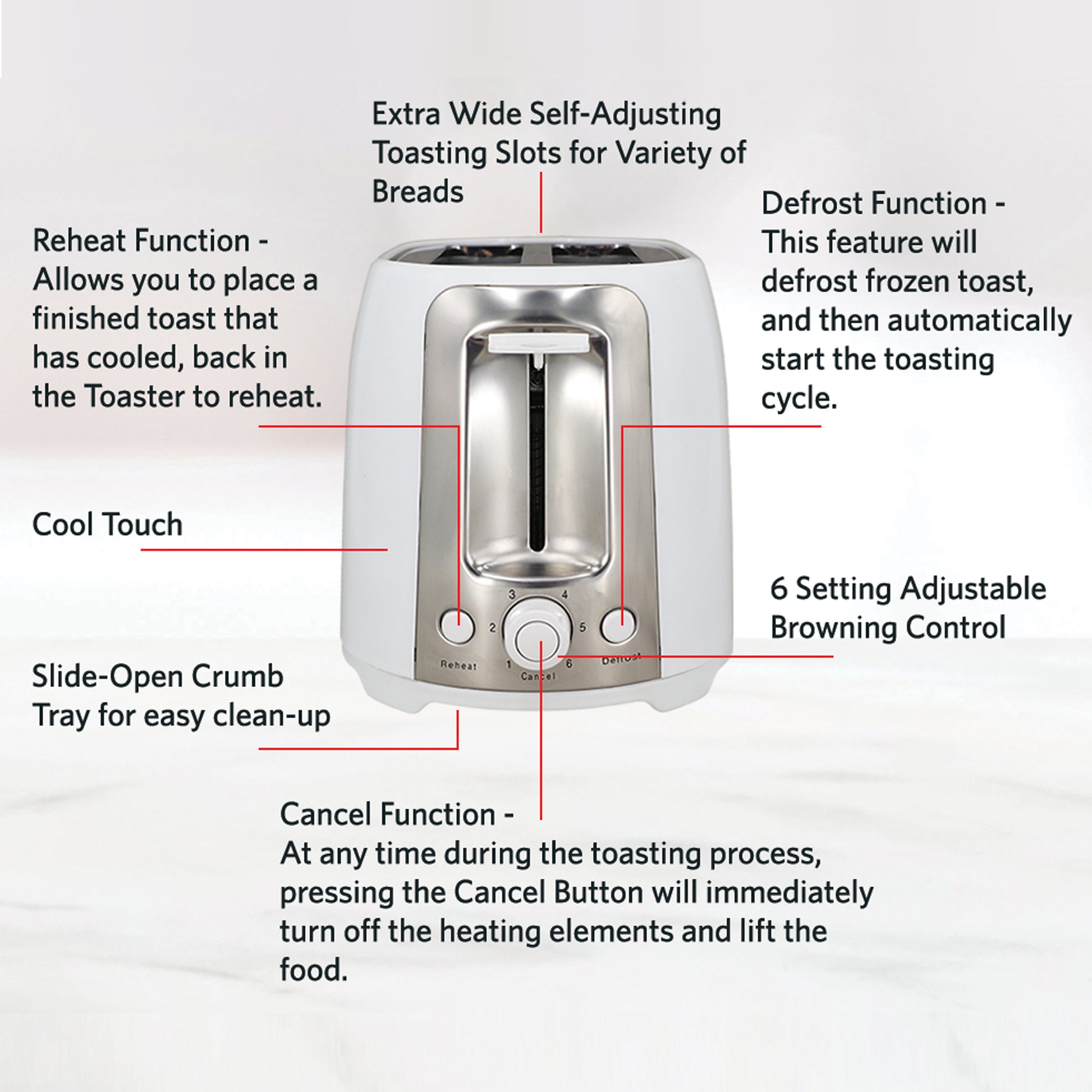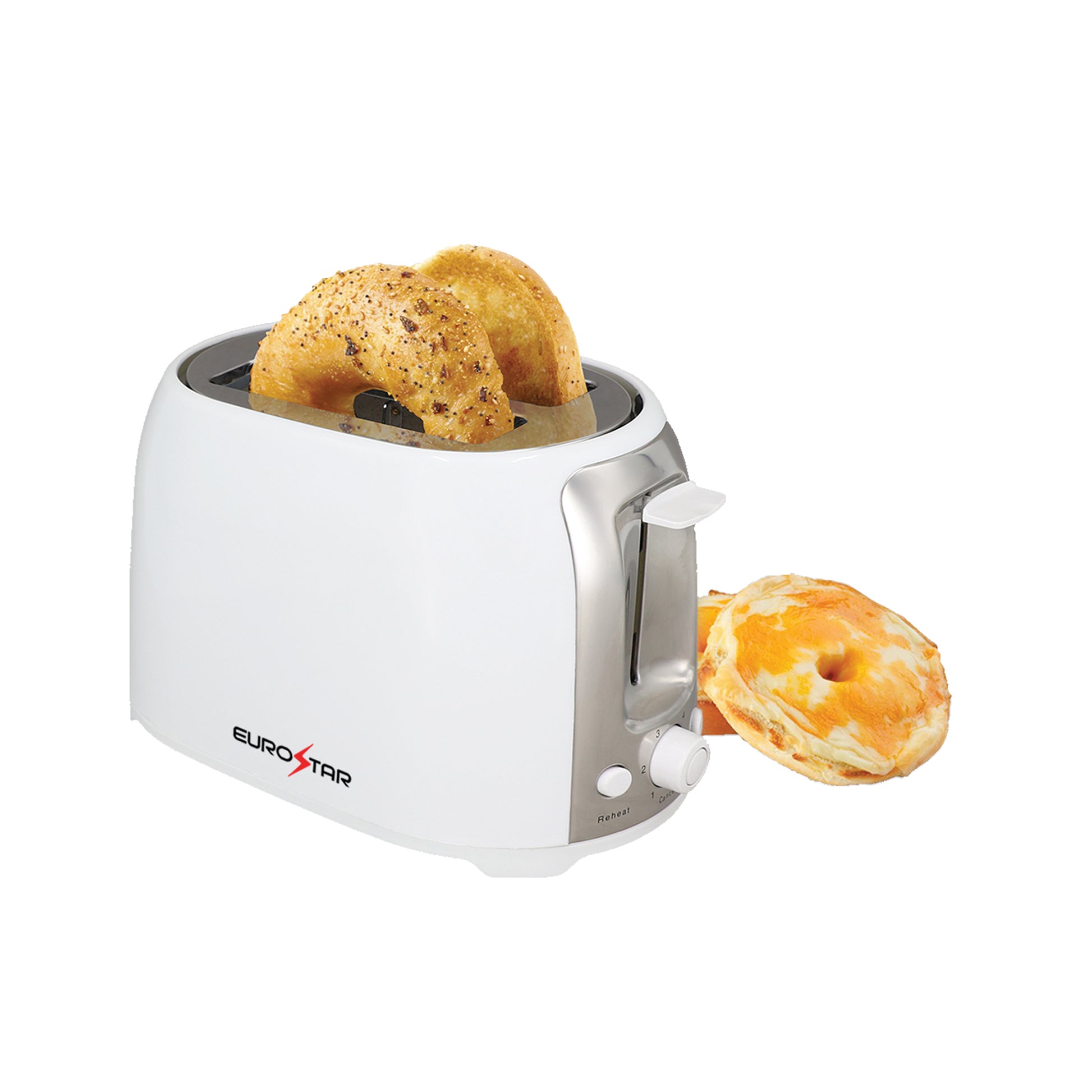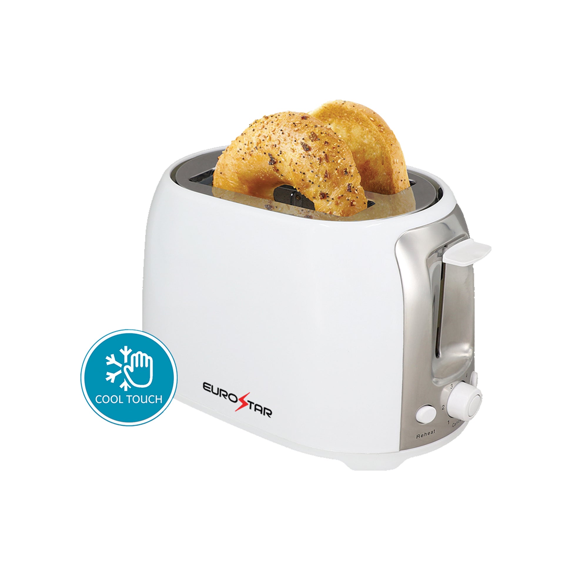 The EUROSTAR Cool Touch toaster is the perfect choice for any everyday busy body. Made with wide slots to fit more than just bread. Toss in bagels, waffles or Texas Toast for a special morning that demands for something better than basic toast. Reheat cold toast or defrost premade waffles with the reheat and defrost buttons. Make a quick snack just the way you want it with the simple adjustable browning control. The toaster includes a quick cancel button and an easy to clean crumb tray. Its built with a cool-touch exterior and you your safety and convenience in mind.