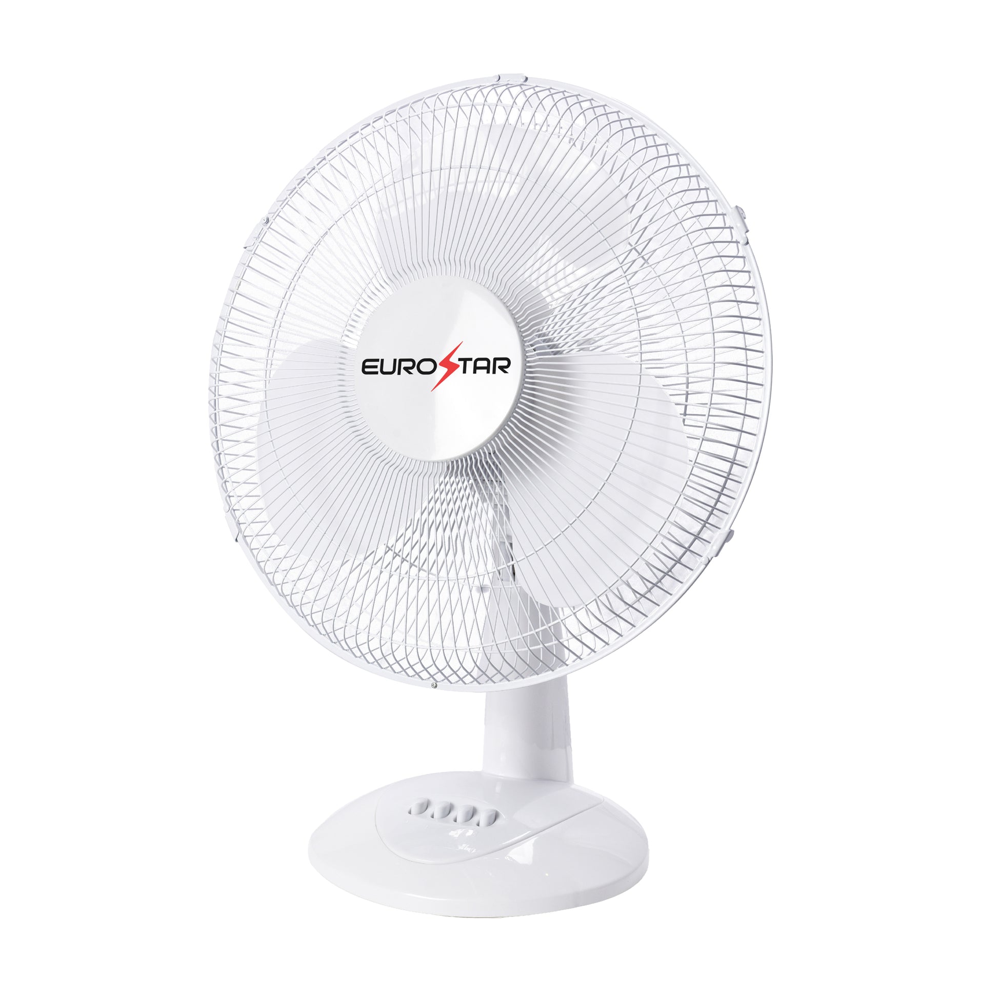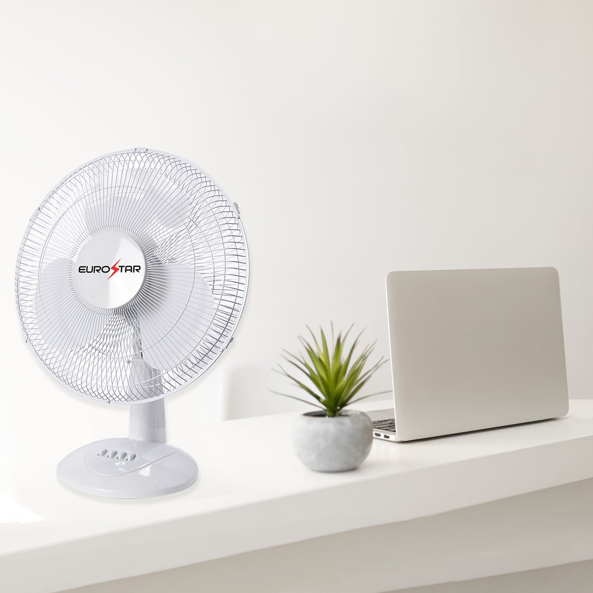 Beat the heat with the Eurostar Desktop Fan, designed to deliver powerful airflow in a compact, stylish design. With a 40-watt motor and three speed settings, you can customize your cooling experience. The oscillating function and adjustable tilt head ensures maximum air circulation, making it perfect for your home or office.