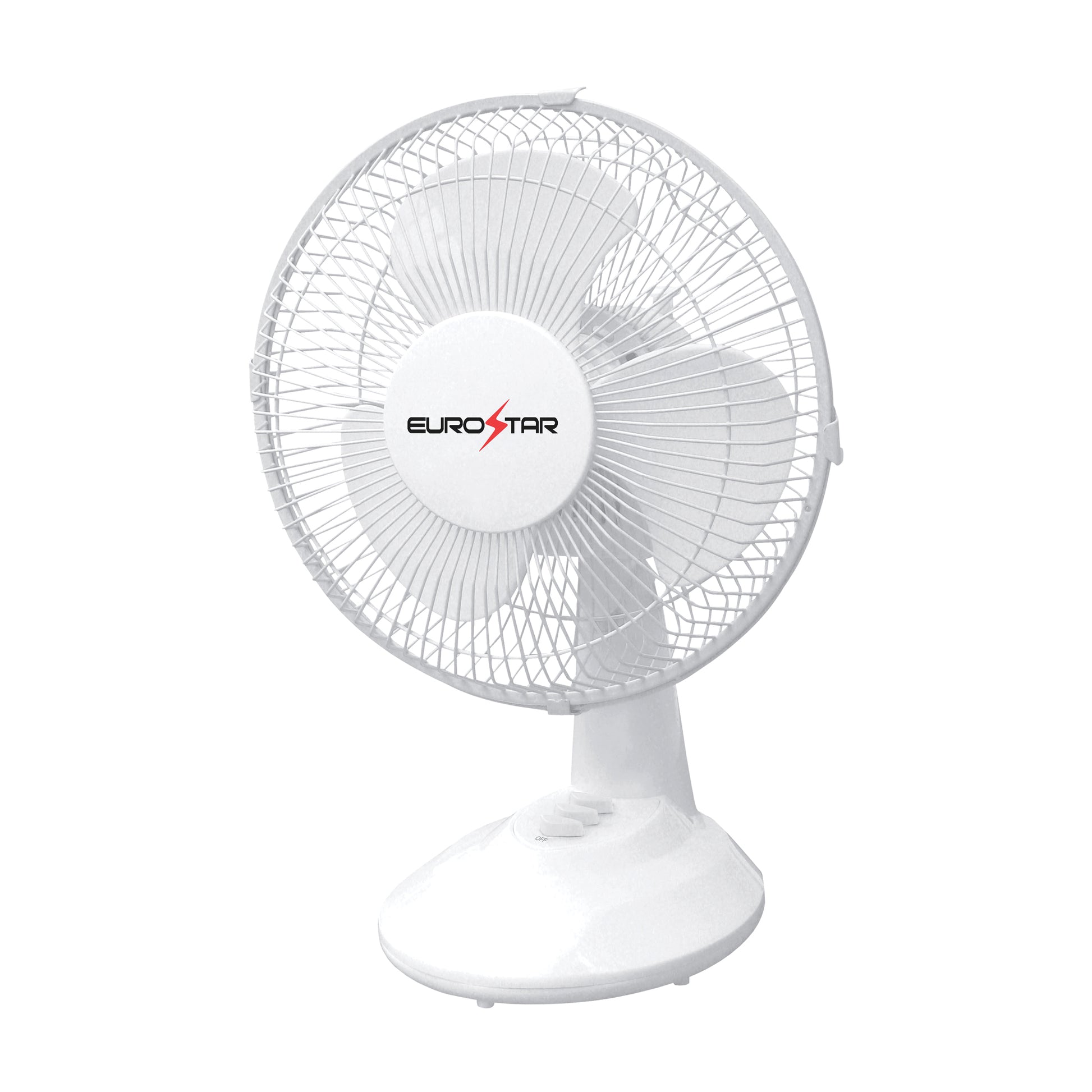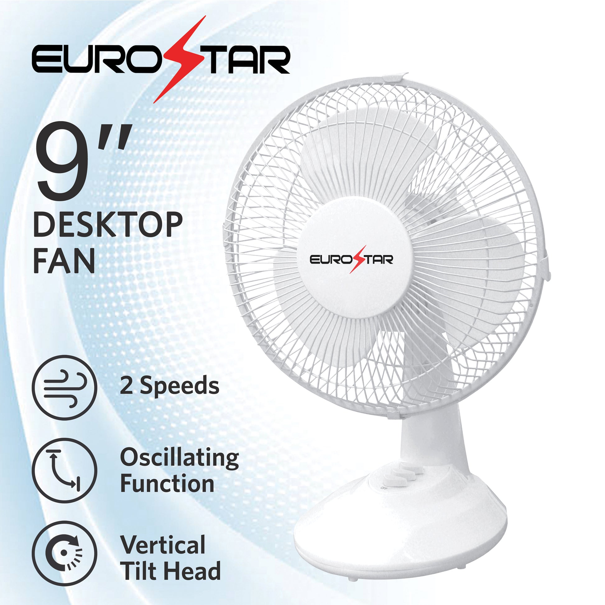 Beat the heat with the Eurostar Desktop Fan, designed to deliver powerful airflow in a compact, stylish design. With a 40-watt motor and two speed settings, you can customize your cooling experience. The oscillating function and adjustable tilt head ensures maximum air circulation, making it perfect for your home or office.