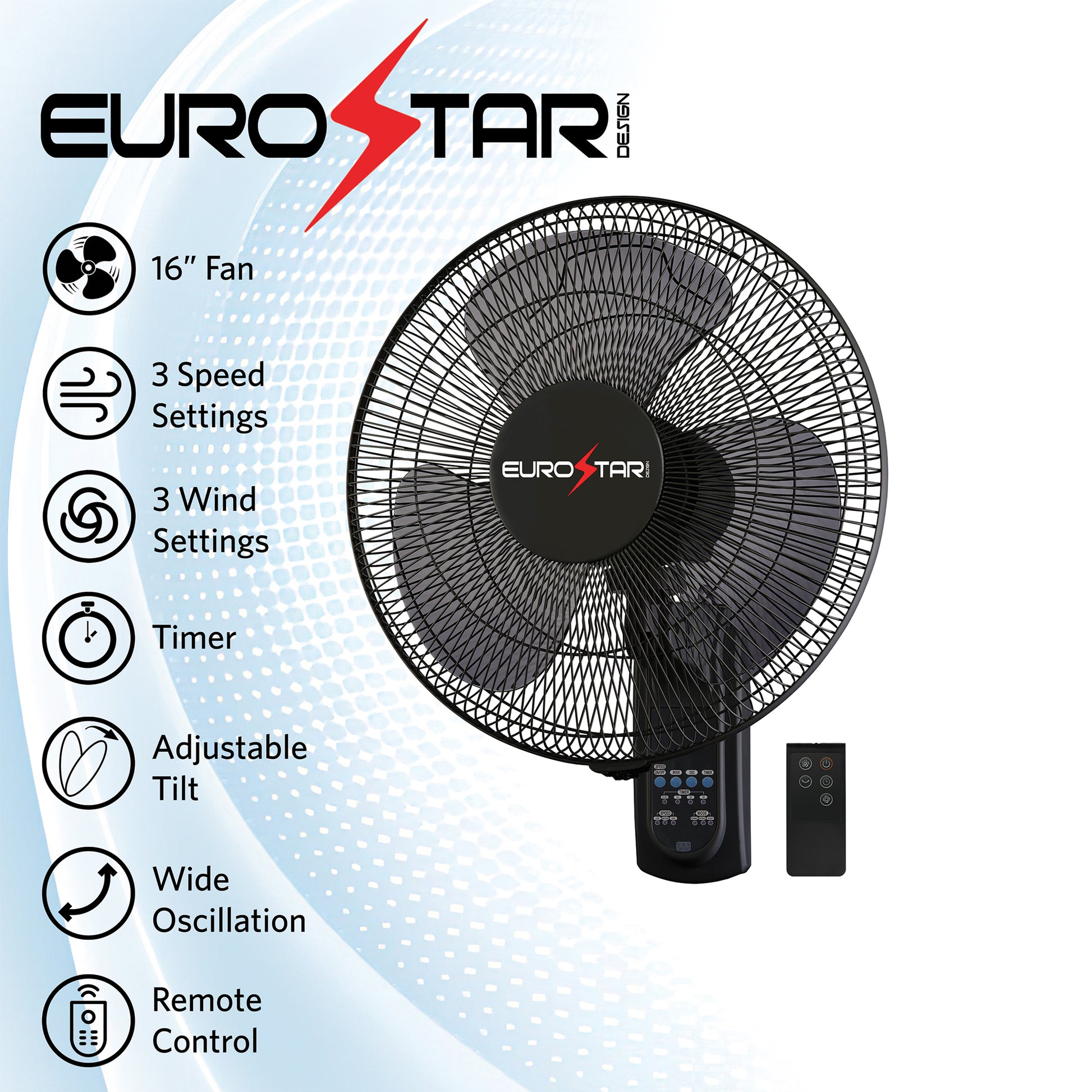 Stay cool and comfortable with the EUROSTAR 16" Wall Mount Fan, designed for powerful airflow and customizable cooling. With 3 speed settings, 3 wind modes, and a wide oscillation feature, this fan ensures optimal air circulation for any room. The adjustable tilt head allows you to direct airflow where you need it most, while the convenient remote control and timer function add ease to your cooling experience. Perfect for homes, offices, gyms, and more.