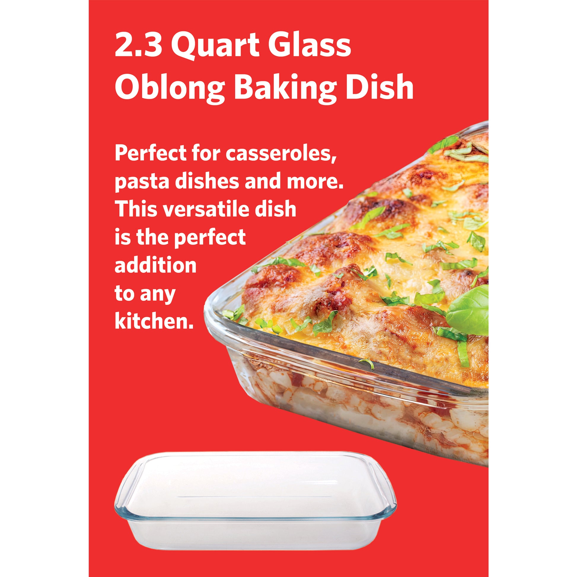 2.3 Quart durable, high-quality tempered glass for even heating. Dishwasher, freezer, microwave and oven safe. Easy to clean. Perfect for casseroles, pasta dishes and more. This versatile dish is the perfect addition to any kitchen.