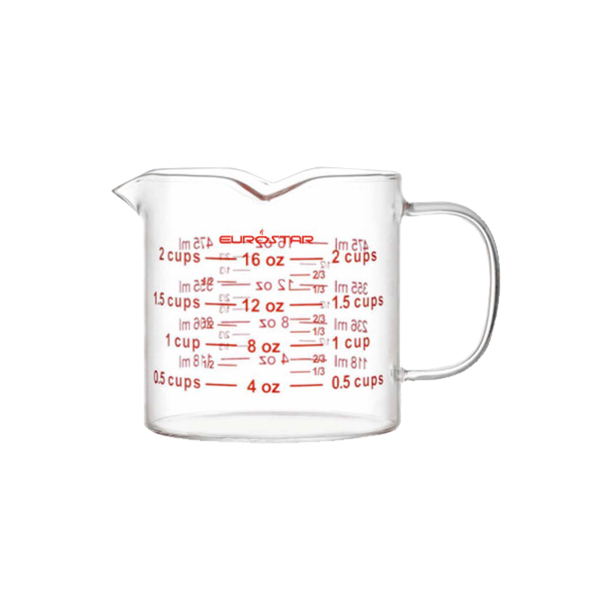 16oz Durable, high quality tempered glass with easy to read, bold measurements (metric and standard). Features three pour spouts and a see-through base for easy monitoring.