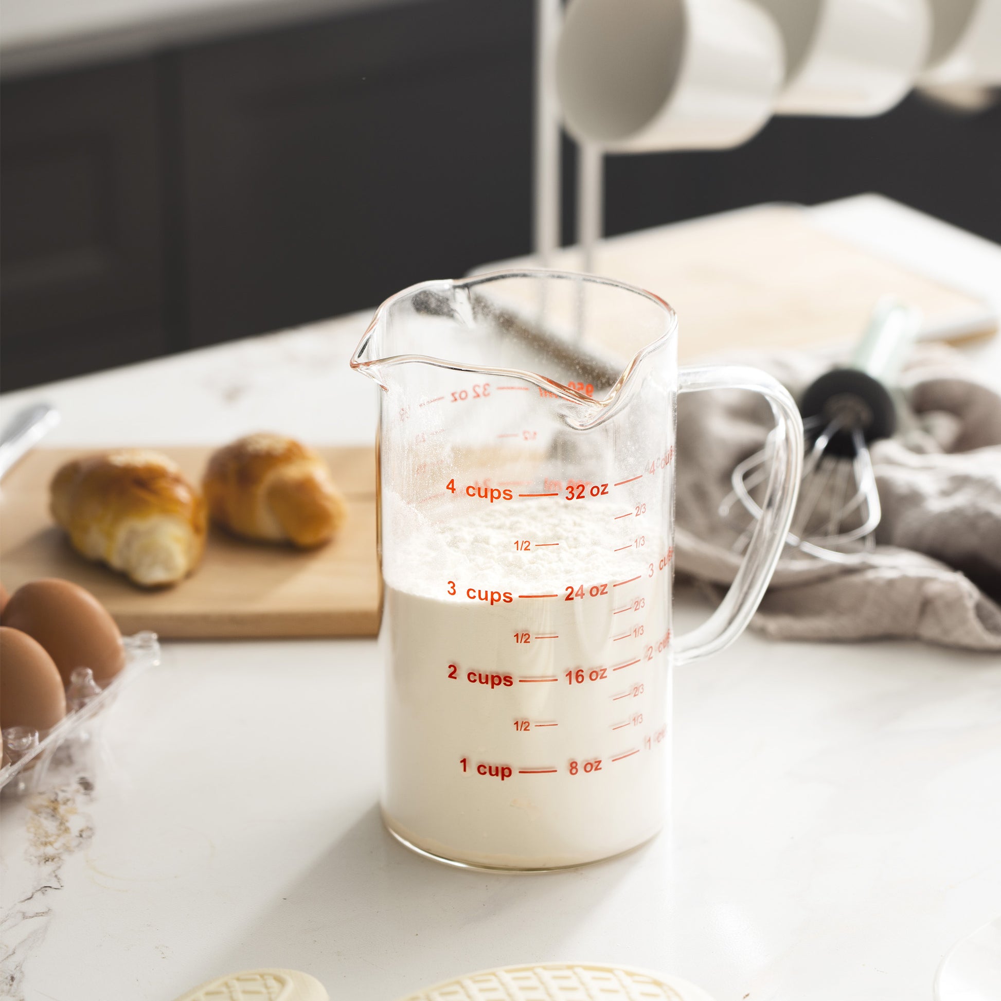 32oz Durable, high quality tempered glass with easy to read, bold measurements (metric and standard). Features three pour spouts and a see-through base for easy monitoring.