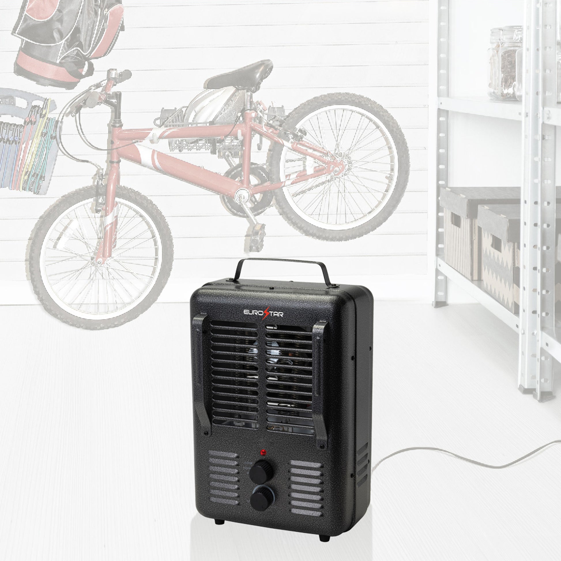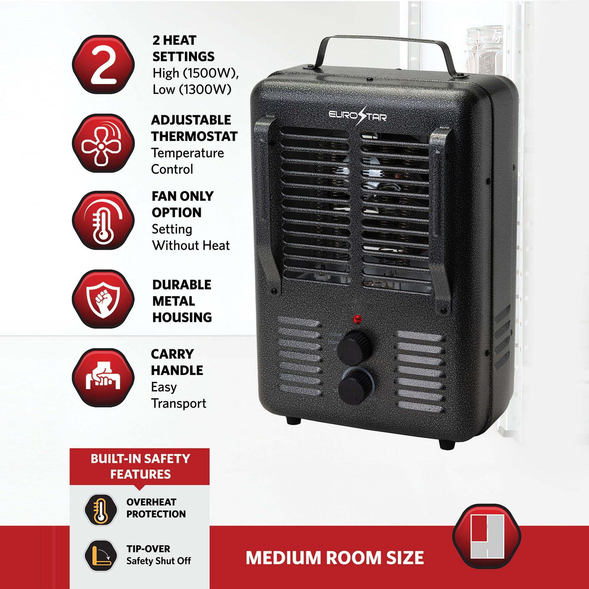 Stay warm and comfortable with the EUROSTAR Milkhouse Utility Heater, a powerful 1500W heating solution designed for medium-sized rooms, garages, or workspaces. With two heat settings and a fan only mode, this versatile heater provides warmth in winter and cooling airflow in warmer months. The adjustable thermostat lets you set your ideal temperature, while the durable metal housing ensures long-lasting performance.