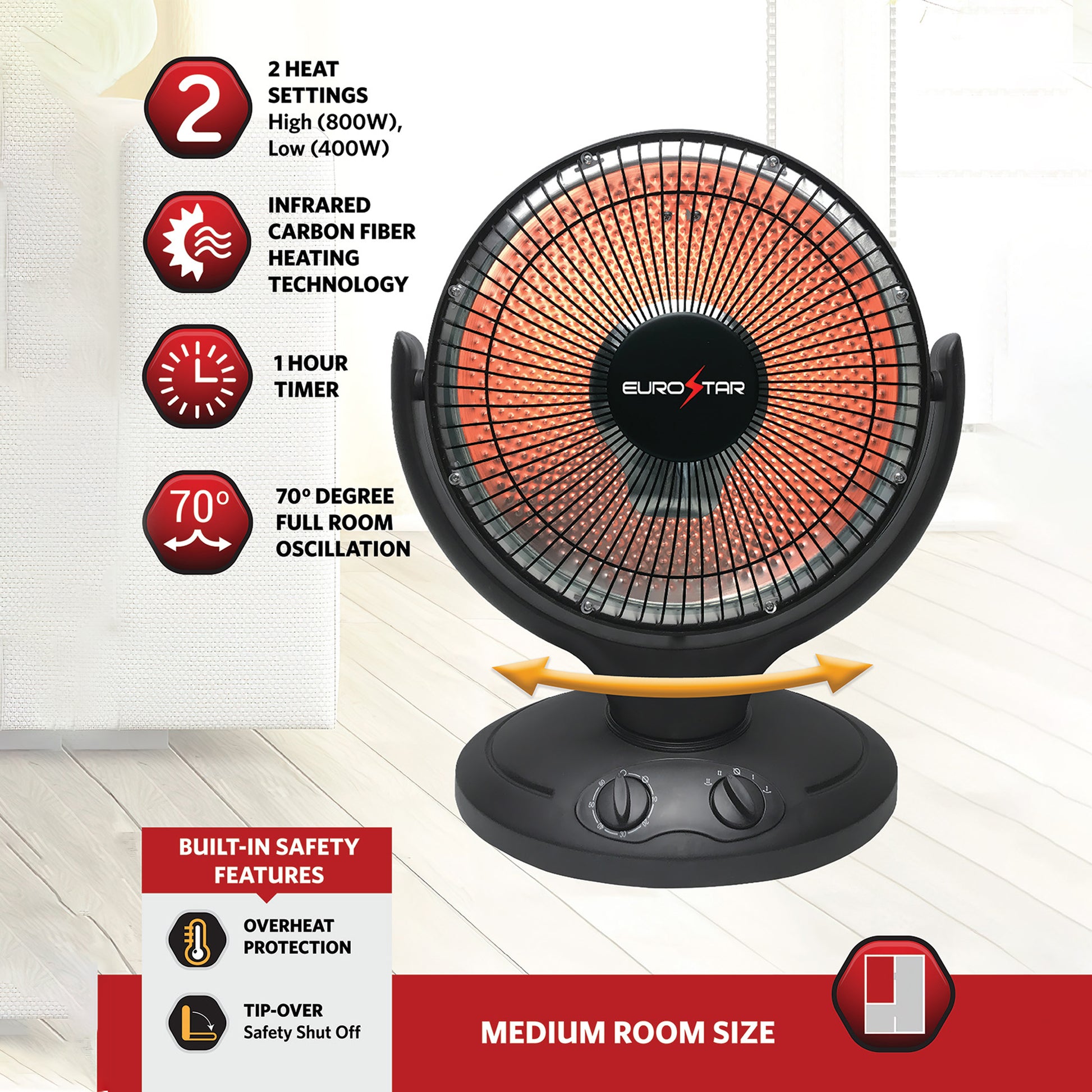 Upgrade your comfort and enjoy a safer, smarter heating experience with the EUROSTAR Infrared Oscillating Dish Heater. Stay cozy and secure with every use!