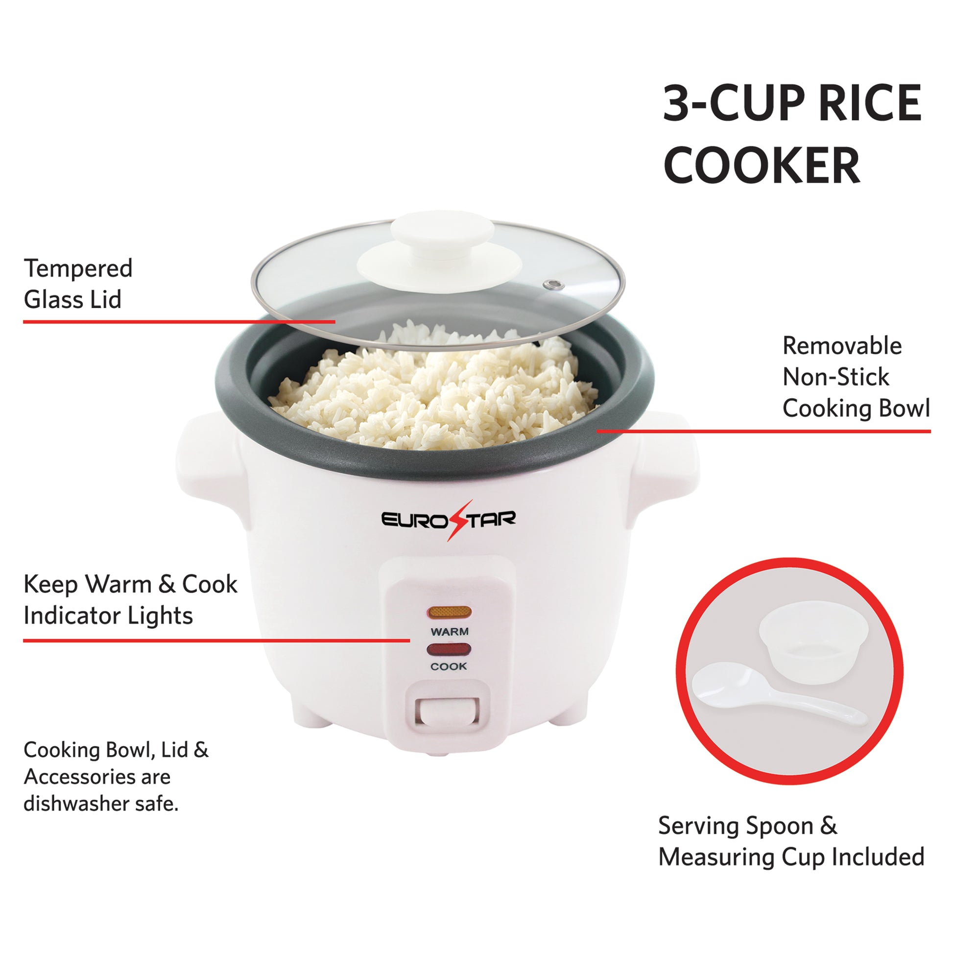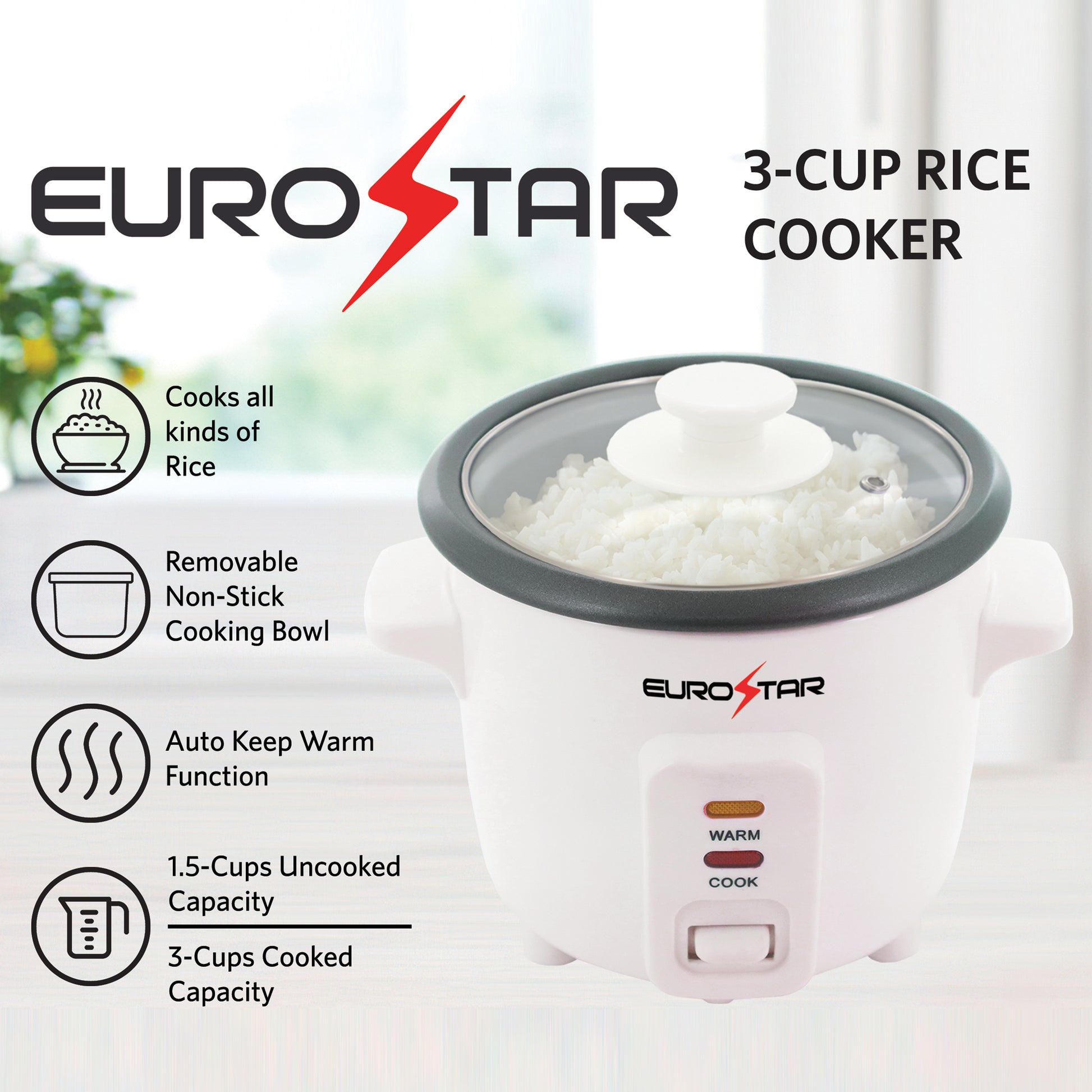 Effortlessly cook fluffy, delicious rice with the EUROSTAR Rice Cooker. Ideal for singles, couples, or small families, this compact cooker handles 1.5 cups of uncooked rice , yielding 3 cups of deliciously cooked rice. The auto keep warm function ensures your rice stays hot and ready to serve, while the non-stick removable bowl makes cleanup a breeze.