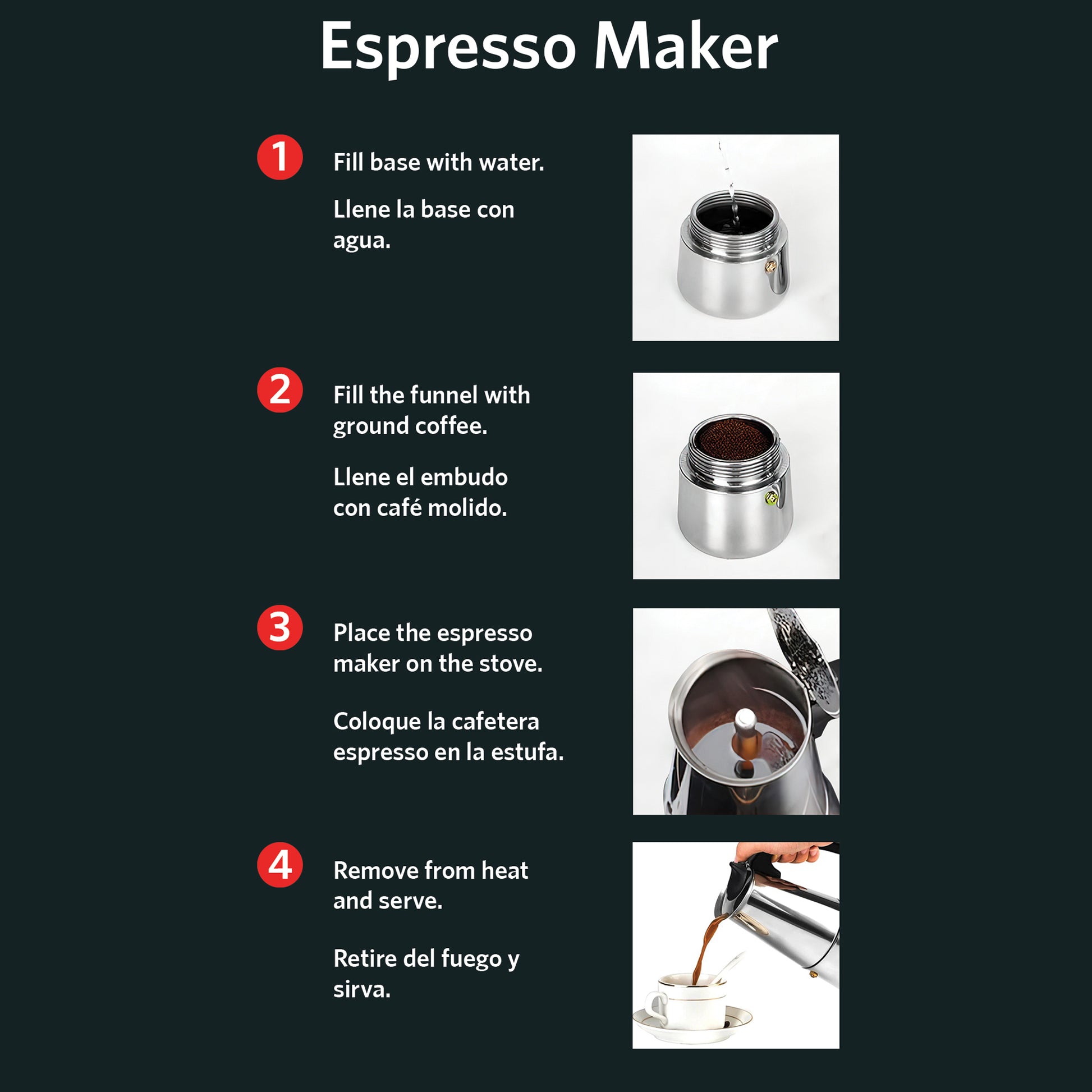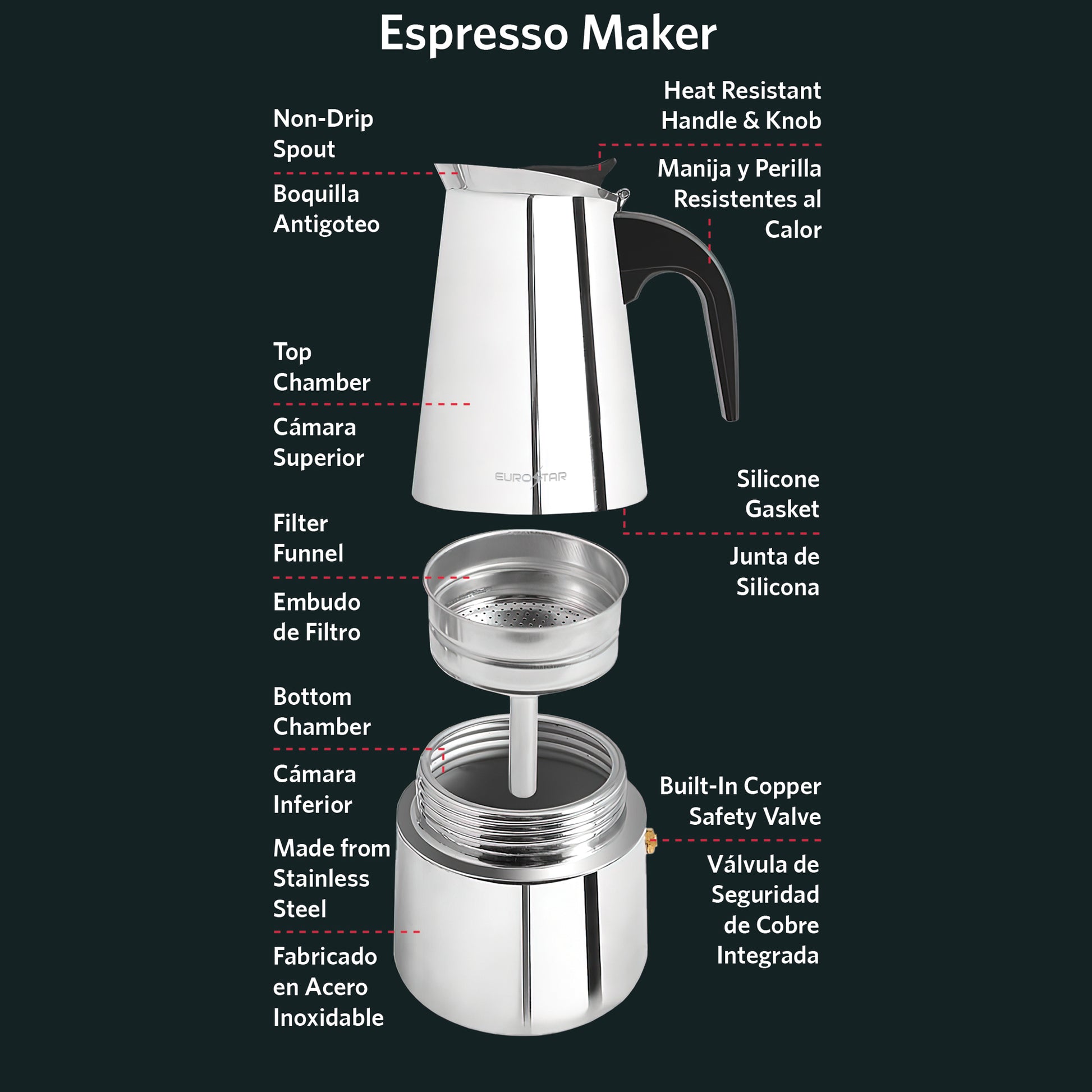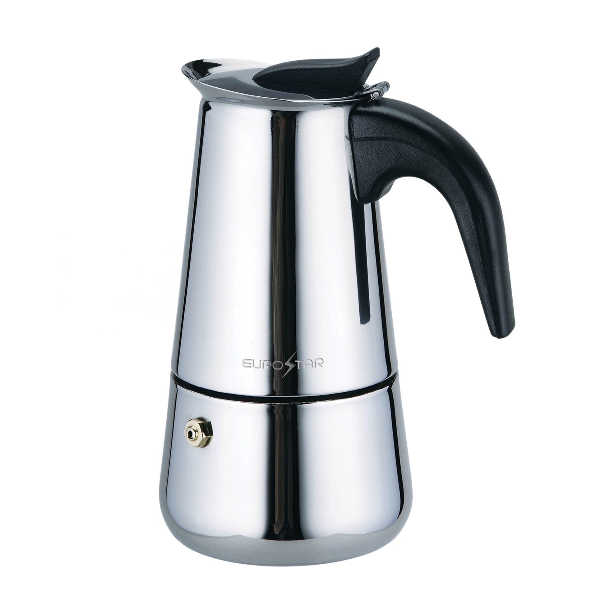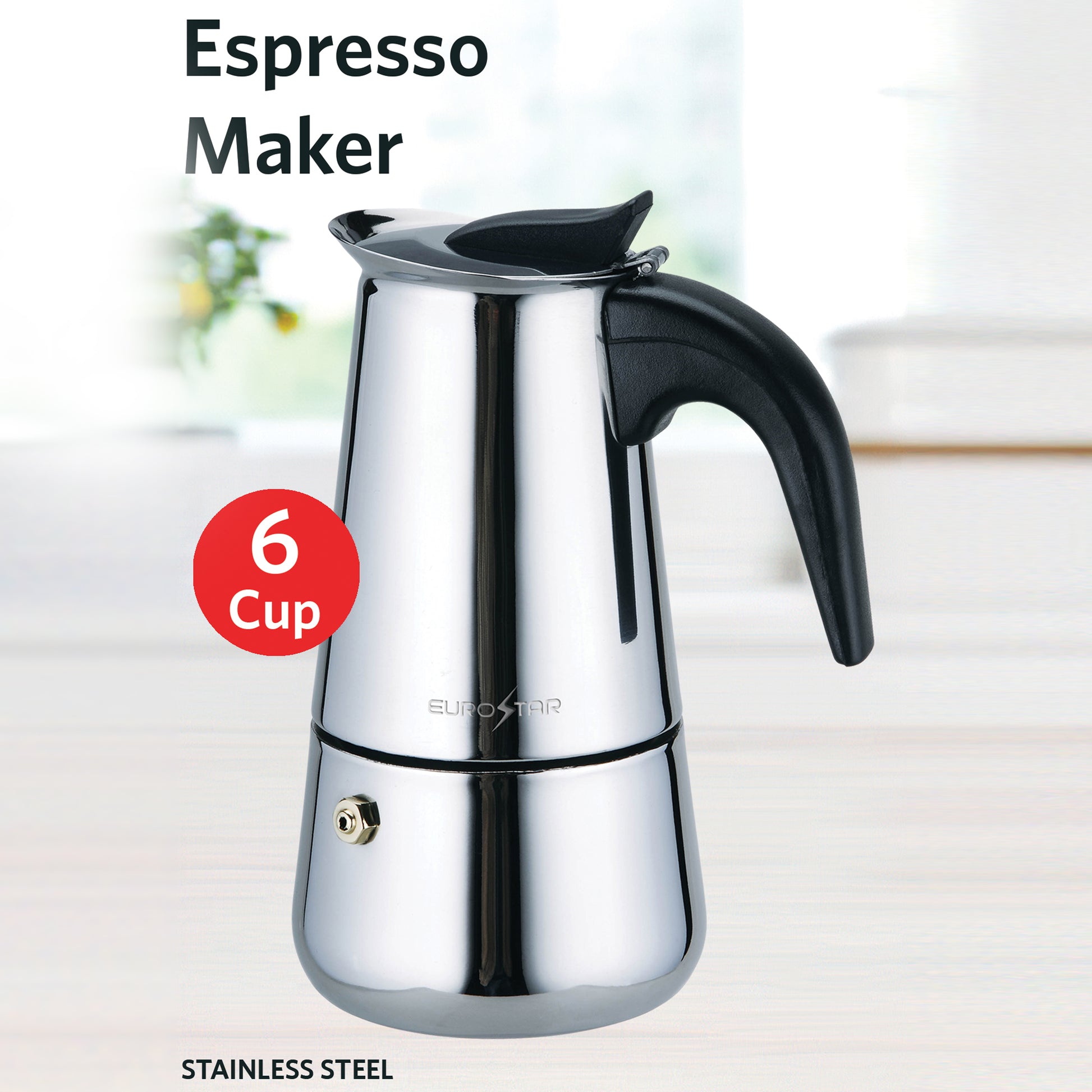Indulge in cafe-quality espresso from the comfort of your home with the EUROSTAR 6-Cup Espresso Maker. Crafted for durability and precision, it features a stainless steel bottom chamber, for even heat distribution, a built-in copper safety valve for perfect pressure control, and a non-drip spout for mess-free pouring. The heat-resistant handle and knob ensure safe handling, while the silicone gasket and filter funnel enhance the brewing process. Whether you're starting your morning or entertaining guests, this espresso maker delivers rich, bold flavor every time. Upgrade your coffee game today!
